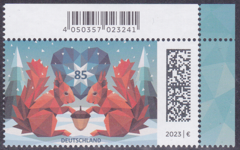 Auf dieser Marke der Deutschen Post (MiNr 3798) zeigt eine kubistische Darstellung zweier Eichhörnchen (Sciurus vulgaris) mit Eichel in einer Winterlandschaft. Hier bilde ich Eckrandstück mit EAN-Codier ab ab.