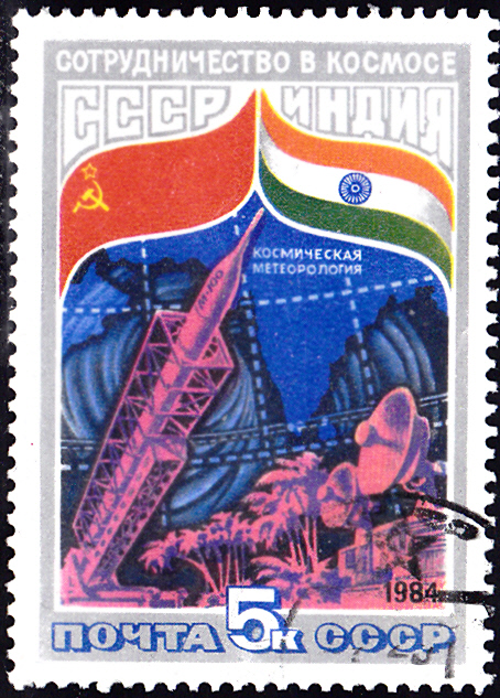 Von dieser Ausgabe zum Gemeinsamen Weltraumflug UdSSR-Indien beim Interkosmosprogramm kann ich noch eine Marke (MiNr 5372) mit einem Satellit und einem Observatorium zeigen.