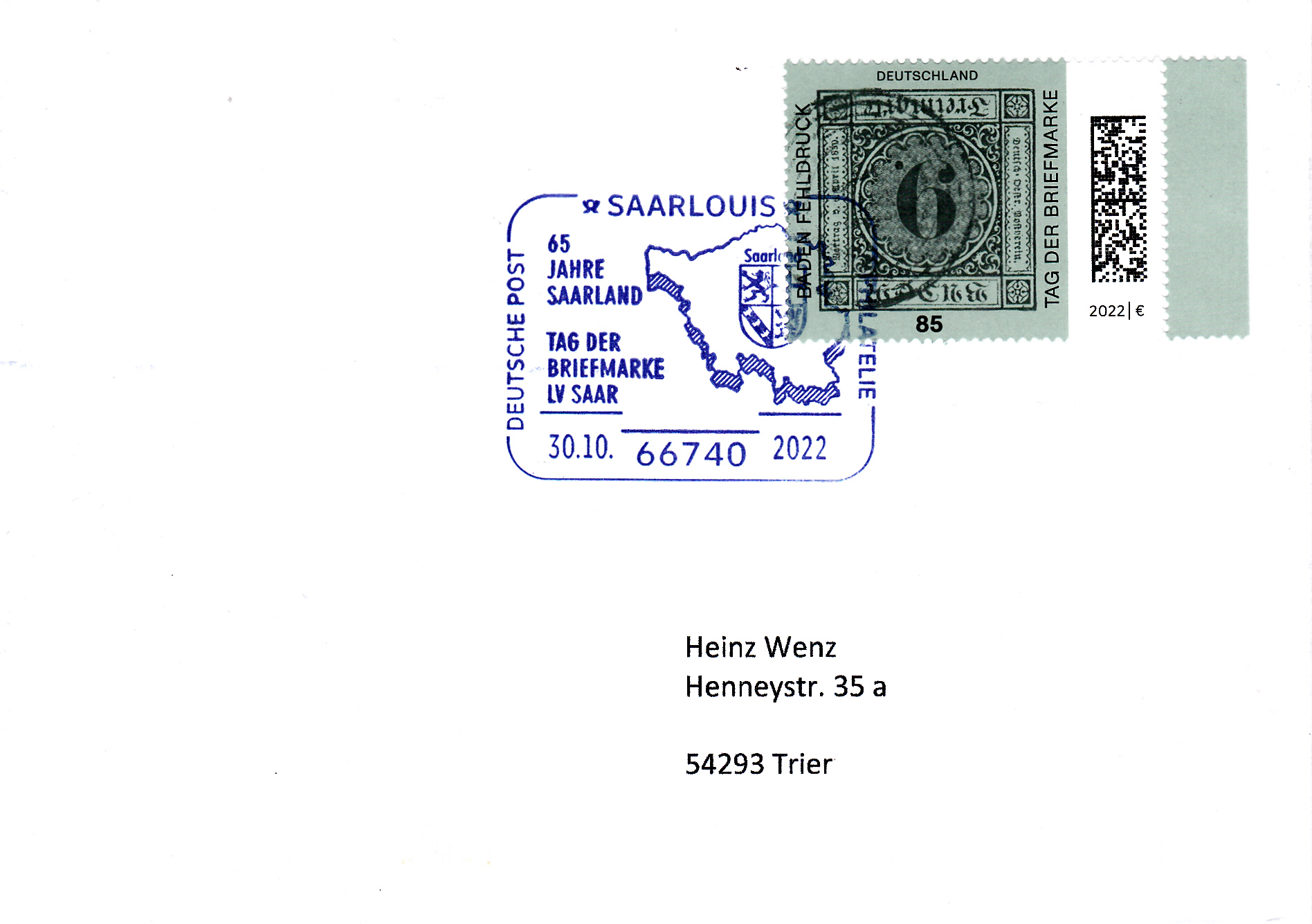 Sonderstempel vom 30.10.2022 aus Saarlouis zum Tag der Briefmarke 2022 des LV Saar.