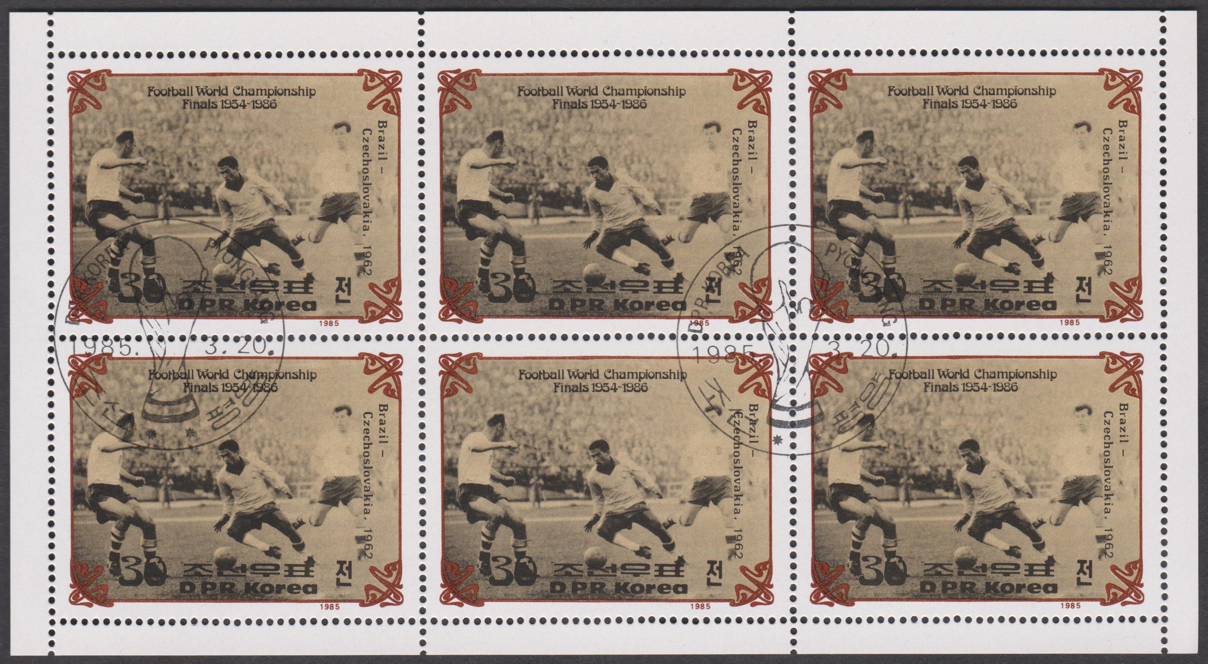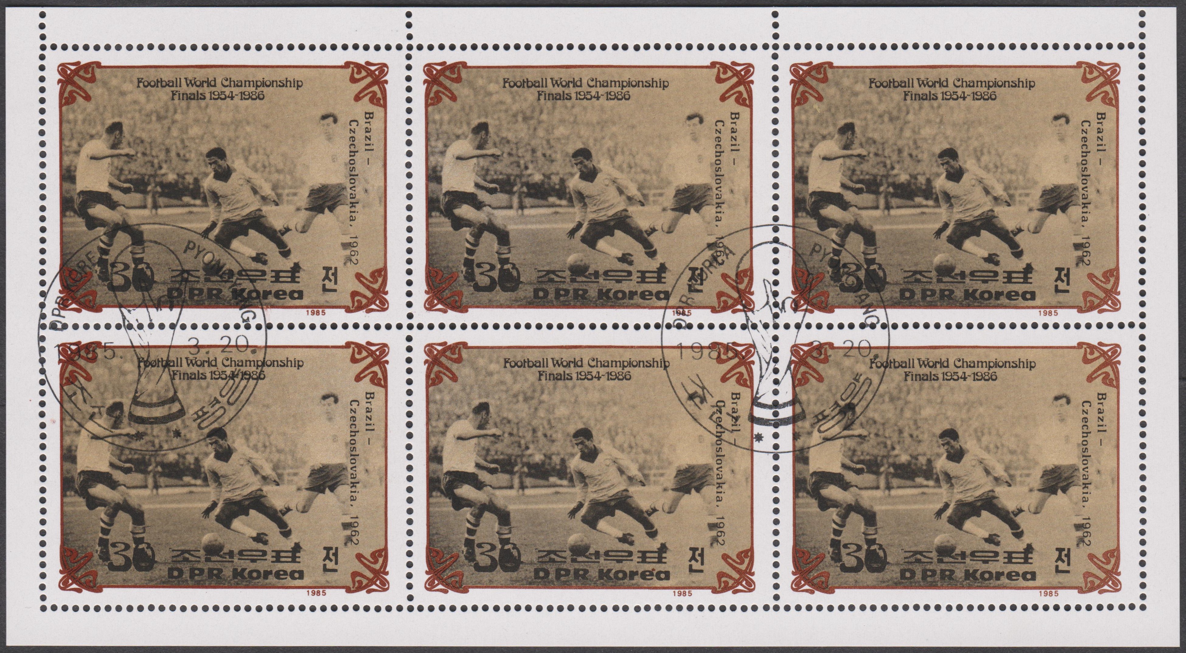 Diese Marke (MiNr 2249 A) aus Ungarn zur Fußball-WM 1966 erinnert an das Endspiel der WM von 1962. Sie zeigt zwei Spieler in den Nationaltrikots von Brasilien und der Tschechoslowakei vor einer Weltkarte mit dem Endspielort des WM-Finalspiels der WM 1962 und dem Resultat des Spieles.
