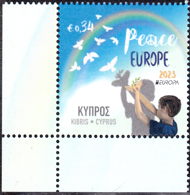 Die Europamarken 2023 sind in Zypern am 6. Mai 2023 zum Thema "Frieden - der höchste Wert der Menschheit" erschienen. Die Marke zu 0,34€ zeigt die Abbildung "Kind formt Schattenspiel-Taube mit Olivenzweig und Tauben im Flug". Die vierseitig gezähnte Marke (MiNr 1509 A) hat eine Auflage von 55.000 Stück. Hier zeige ich eine Marke vom Eckrand.
