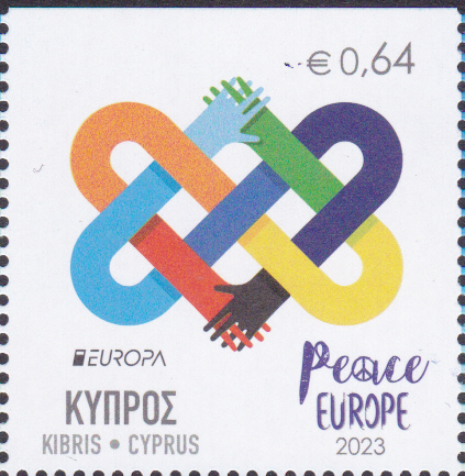 Die Europamarken 2023 sind in Zypern am 6. Mai 2023 zum Thema "Frieden - der höchste Wert der Menschheit" erschienen. Die Marke zu 0,64€ zeigt das Gemeinscahftsmotiv "Herzförmig verknotete Arme mit verschränkten Händen". Die vierseitig gezähnte Marke hat eine Auflage von 55.000 Stück. Hier zeige ich eine Marke vom Eckrand.