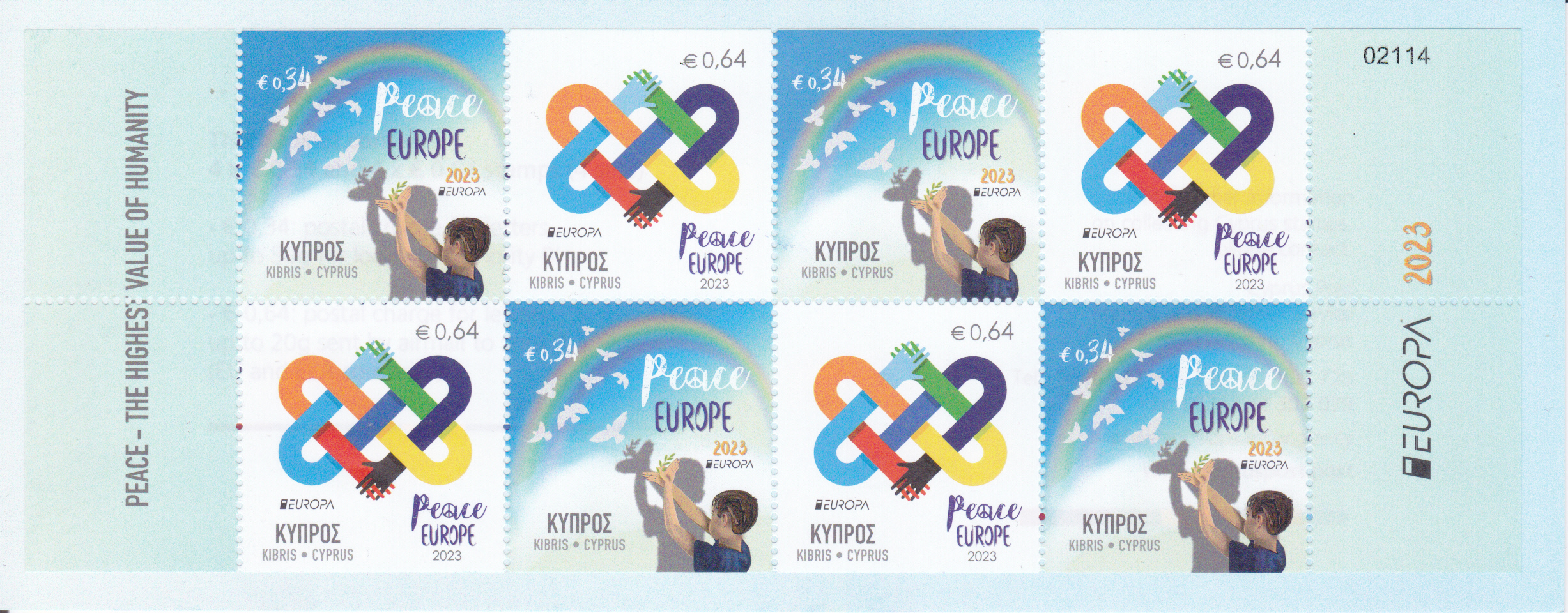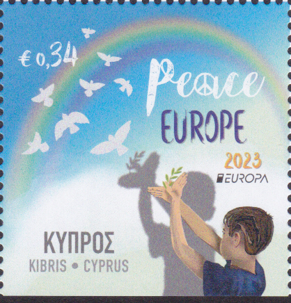 Die Europamarken 2023 sind in Zypern am 6. Mai 2023 zum Thema "Frieden - der höchste Wert der Menschheit" erschienen. Die Marke zu 0,34€ zeigt die Abbildung "Kind formt Schattenspiel-Taube mit Olivenzweig und Tauben im Flug". Die vierseitig gezähnte Marke (MiNr 1509 A) hat eine Auflage von 55.000 Stück. Hier zeige ich eine Marke vom Eckrand.