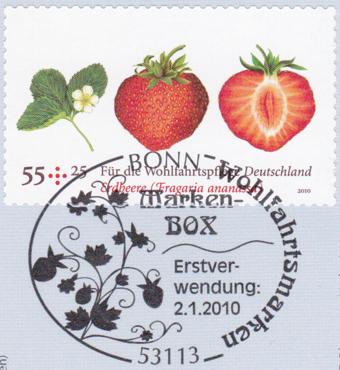 Für die hier schon gezeigte selbstklebende Wohlfahrtsmarke-Marke (MiNr 2777) aus der "Markenbox (=Rolle) mit dem Motiv "Erdbeere" gab es in Bonn auch einen Erstverwendungsstempel mit einem Teil einer Erdbeerpflanze im Stempelbild.