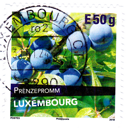 In einer Serie aus Luxemburg werden verschiedene Pflaumenarten gezeigt. Auf dieser Marke (MiNr 2191) sehen wir eine Pflaume mit dem Namen " Prënzepromm" oder "Prune de Prince" (deutsch: Prinzenpflaume). Die "Prinzenpflaume" ist eine in Luxemburg und Belgien seit langer Zeit heimische Sorte.