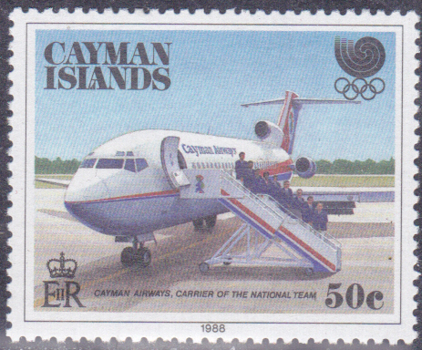 Eine zweite Marke der Kaiman-Inseln (MiNr 609) zeigt eine Boeing 727–200 der Cayman Airways (Flugzeug für den Transport der Olympiamannschaft der Kaiman-Inseln)