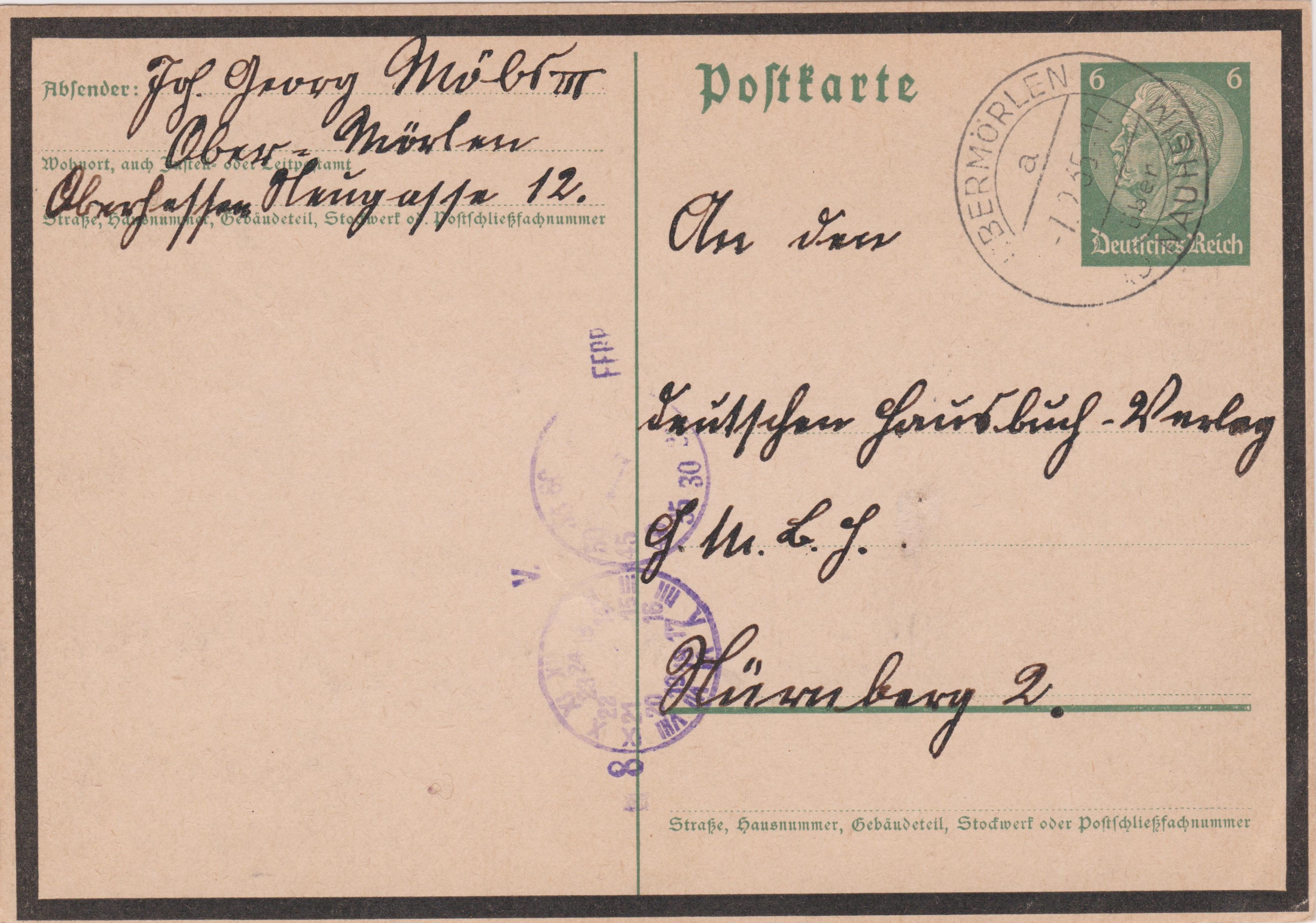 Postkarte der Dauerserie Hindenburg mit Trauerrand mit eingedrucktem Postwertzeichen zu 6 Pf, dem Porto für eine Postkarte im Fernverkehr, gebraucht am 21.01.1935 in OBERMÖRLEN über BAD NAUHEIM: