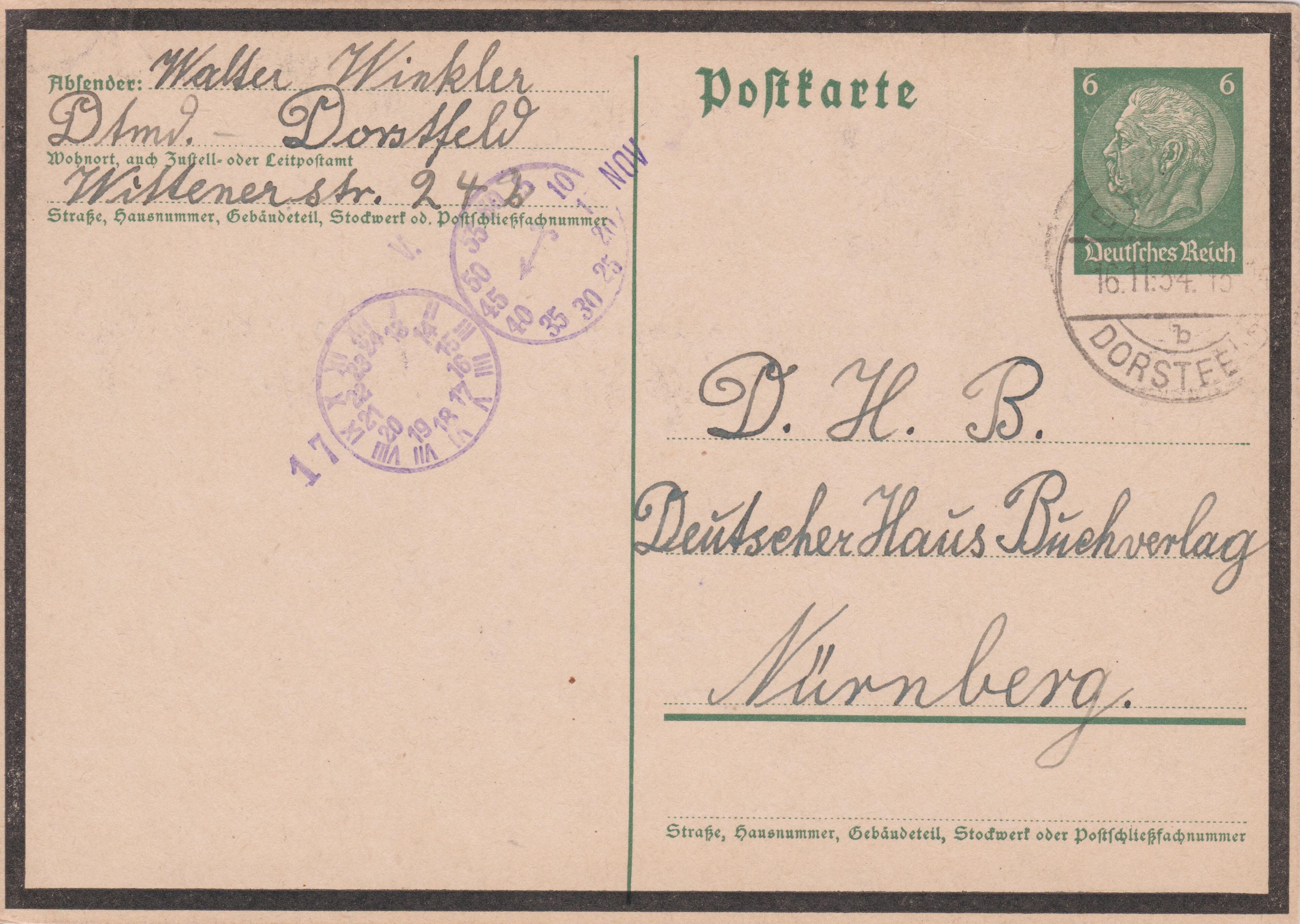 Postkarte der Dauerserie Hindenburg mit Trauerrand mit eingedrucktem Postwertzeichen zu 6 Pf, dem Porto für eine Postkarte im Fernverkehr, gebraucht am 16.11.1934 in DORTMUND-DORSTFELD: