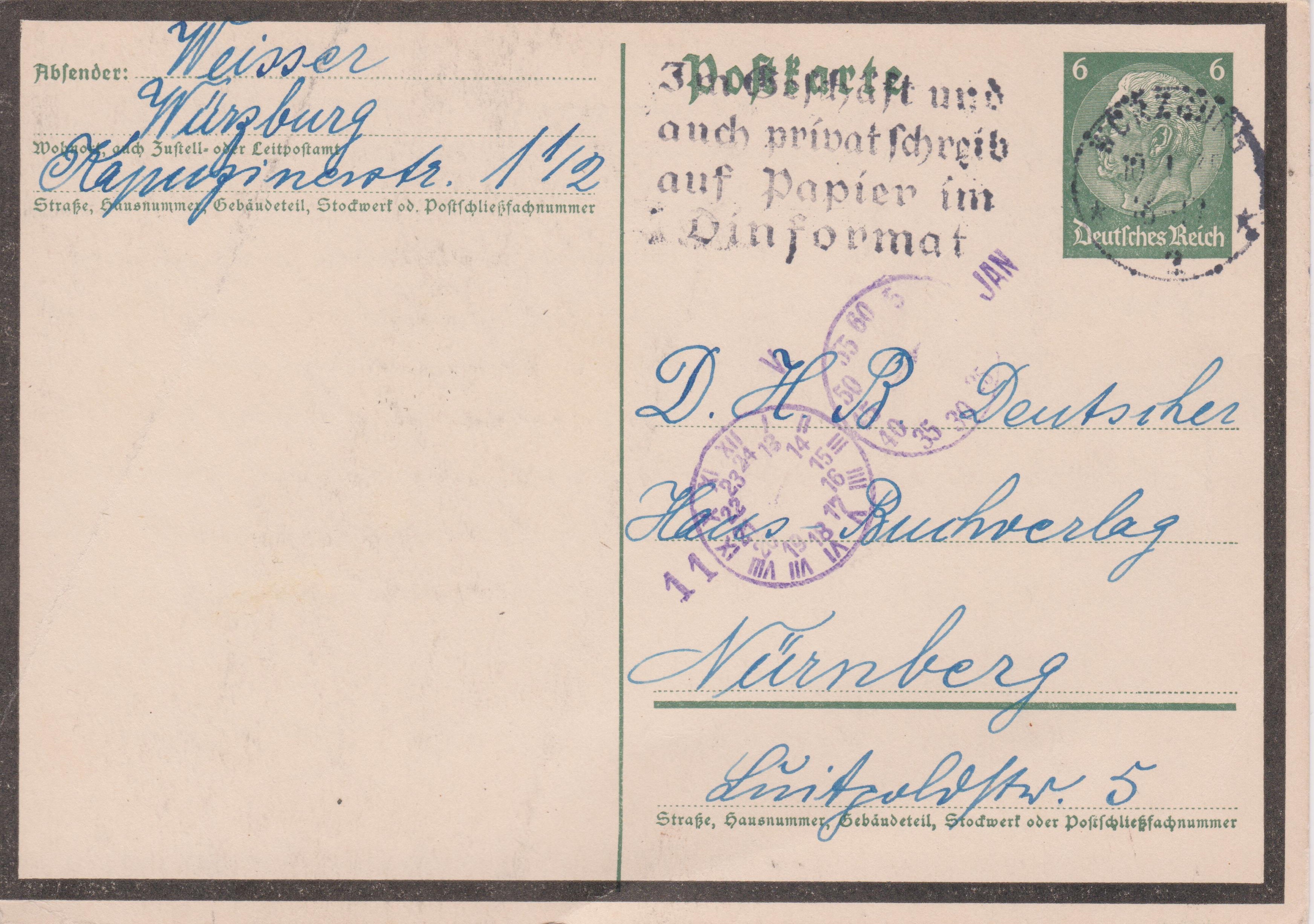 Postkarte der Dauerserie Hindenburg mit Trauerrand mit eingedrucktem Postwertzeichen zu 6 Pf, dem Porto für eine Postkarte im Fernverkehr, gebraucht am 10.01.1935 in WÜRZBURG: