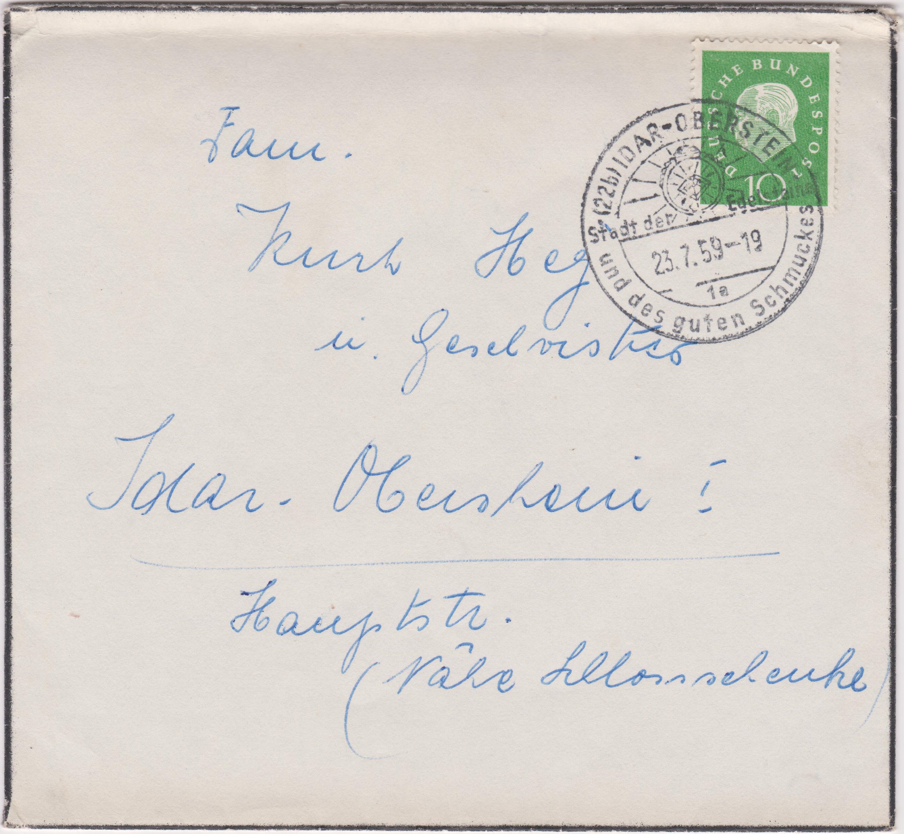 Trauerbrief, freigemacht per Einzelfrankatur mit 10 Pf Dauerserie Heuss, am 23.07.1959 gelaufen im Ortsverkehr von IDAR-OBERSTEIN, entwertet per Handstempel "Stadt der Edelsteine und des guten Schmuckes":