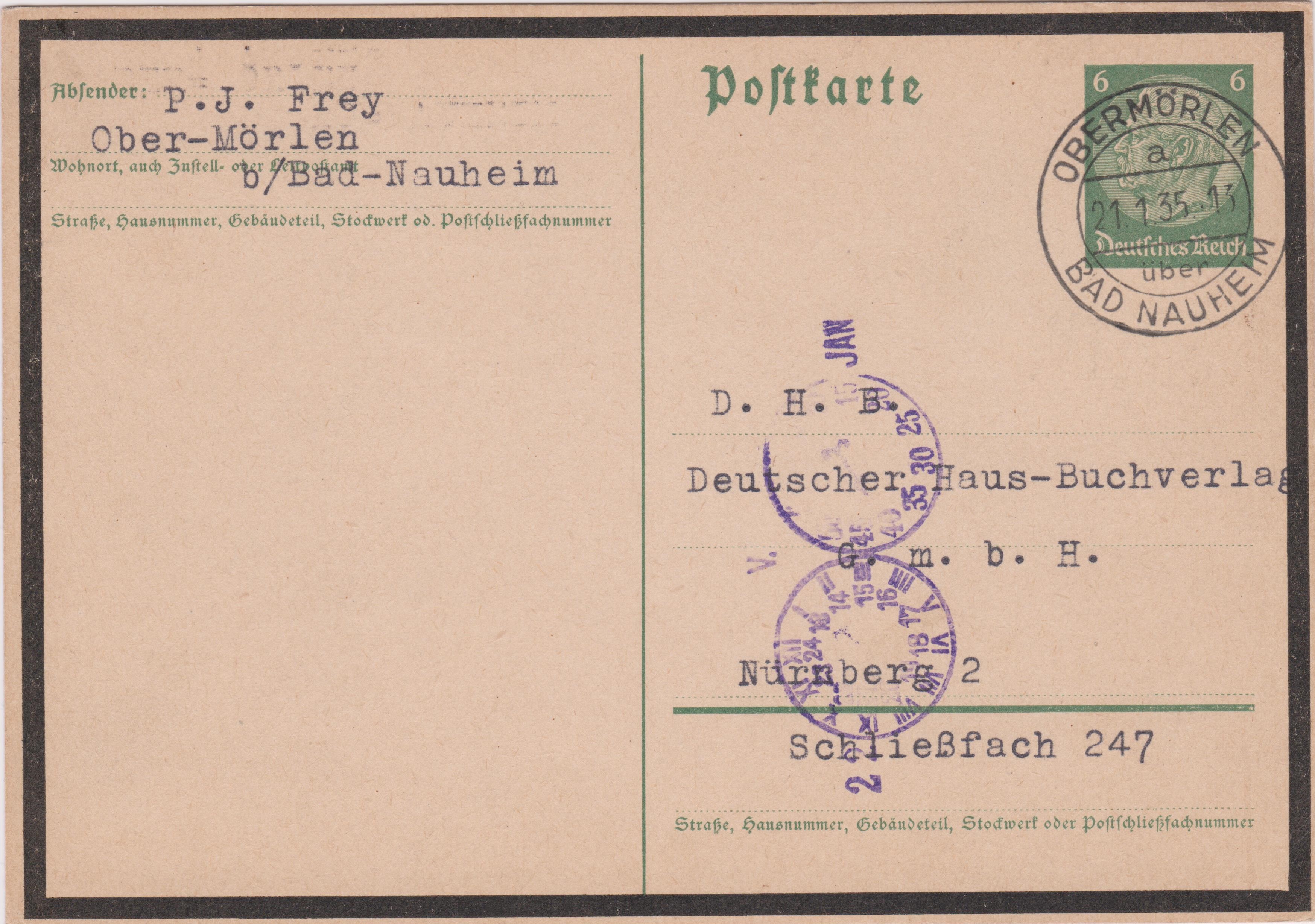 Postkarte der Dauerserie Hindenburg mit Trauerrand mit eingedrucktem Postwertzeichen zu 6 Pf, dem Porto für eine Postkarte im Fernverkehr, gebraucht am 21.01.1935 in OBERMÖRLEN über BAD NAUHEIM: