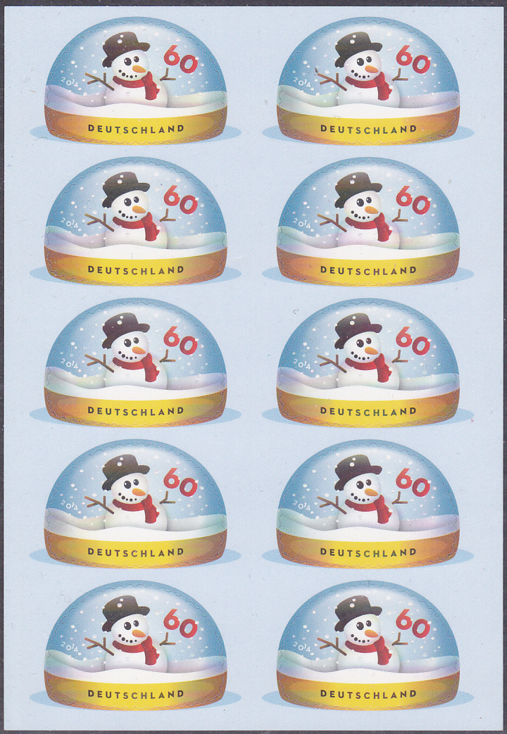 Heute zeige ich zu der selbstklebenden Marke "Schneemann in Schneekugel" (MiNr 3113), die Rüdiger schon auf einem gelaufenen Ersttagsbrief hier zeigte, ein komplettes Folienblatt (MiNr Folienblatt 41).