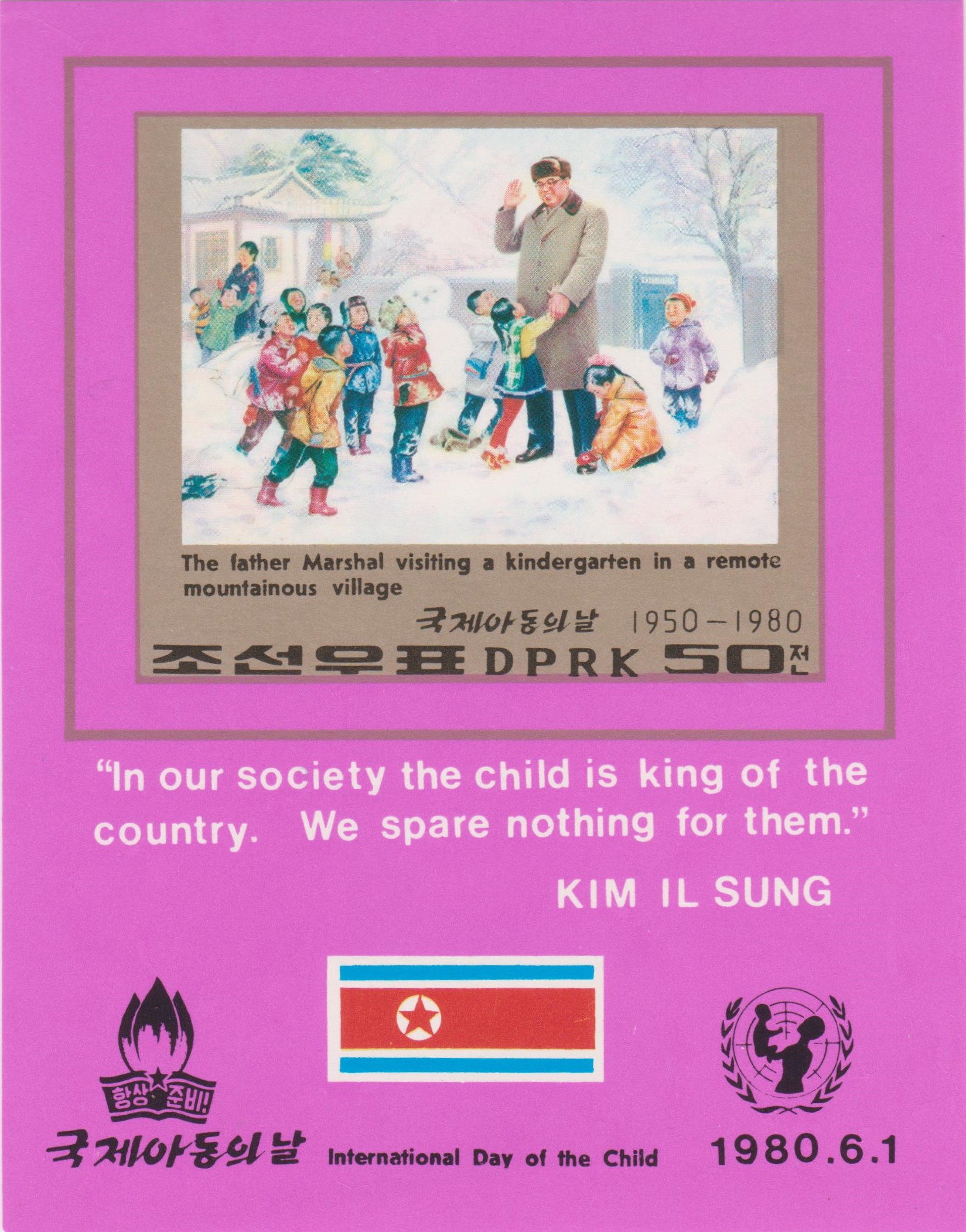 Nordkorea Block 69 A mit MiNr. 1961 mit dem Motiv "Kim II Sung besucht einen Kindergarten" erschien am 28.01.1980 zum Thema 30 Jahre Internationaler Tag des Kindes - UNICEF und zeigt als Nebenmotiv einen Schneemann: