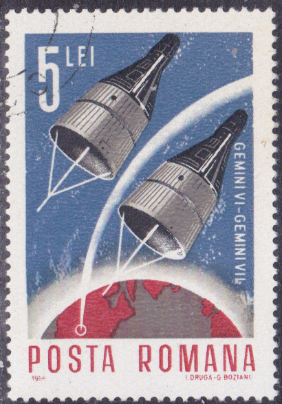 Auch in Rumänien ist 1966 eine Marke (MiNr 2512) erschienen, die Gemini 6A und Gemini 7 beim Rendevous zeigt.