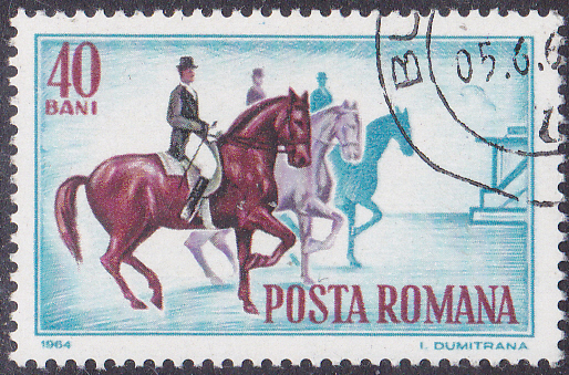 Aus einer Serie "Reitsport" kommt diese Marke aus Rumänien (MiNr 2276) mit einem Dressurreiter am Start.
