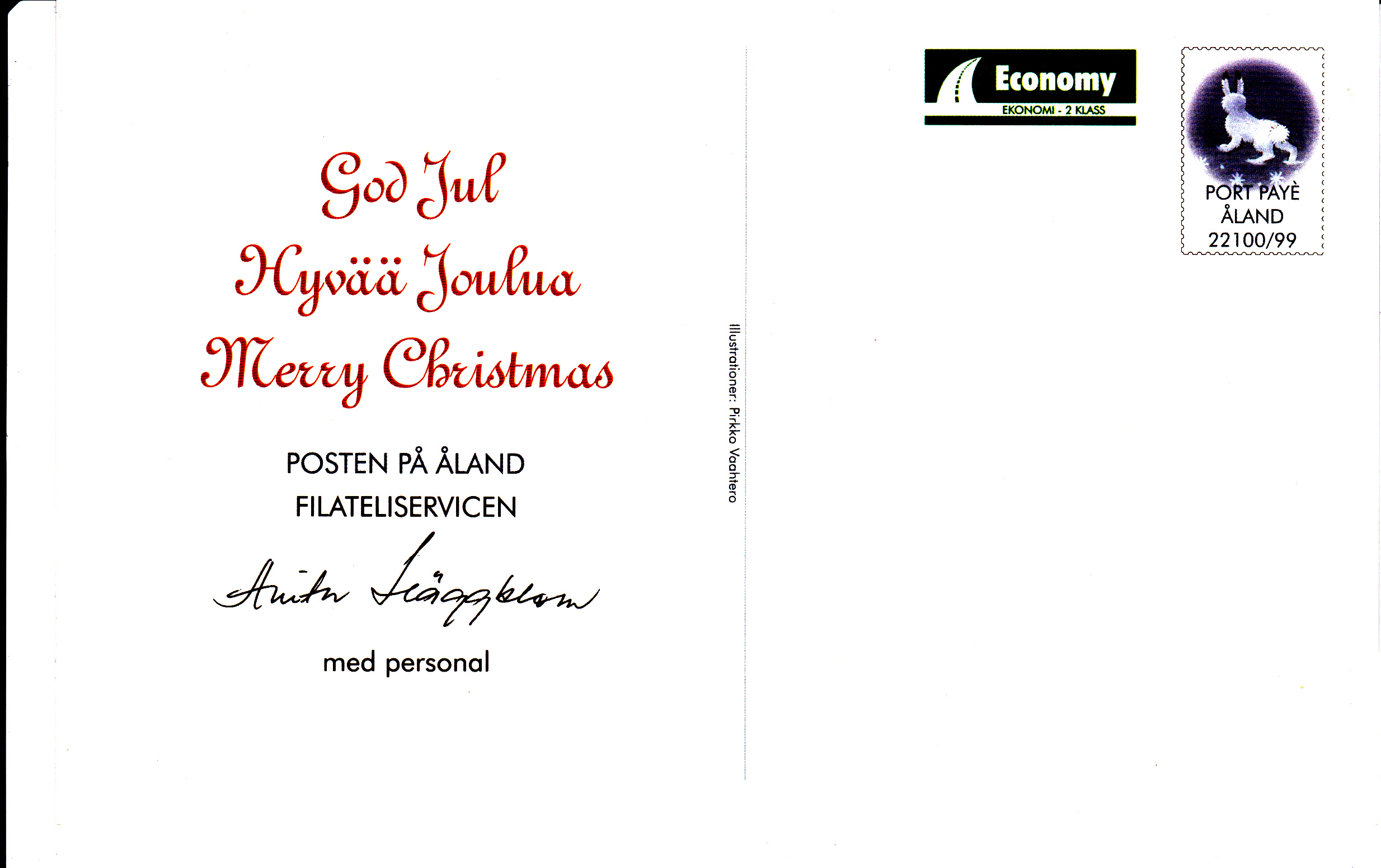 Der Weihnachtswunsch ist hier in drei Sprachen auf dieser Ganzsachenkarte des Philatelieservice aus Aland zu lesen. Auf der Rückseite ist die Weihnachtsmarke 2005 aufgeklebt und mit dem Ersttagssonderstempel aus Mariehamn vom 10.10.2005 abgestempelt.