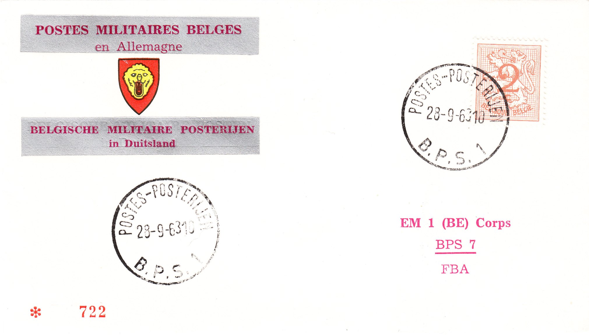 Hier ein aus einem Abonnement stammender Beleg des vom 01.12.1959 bis 1992 in Eschweiler Camp Zeebrugge stationierten B.P.S 2 vom 28.09.1963 mit Tagesstempel Typ K: