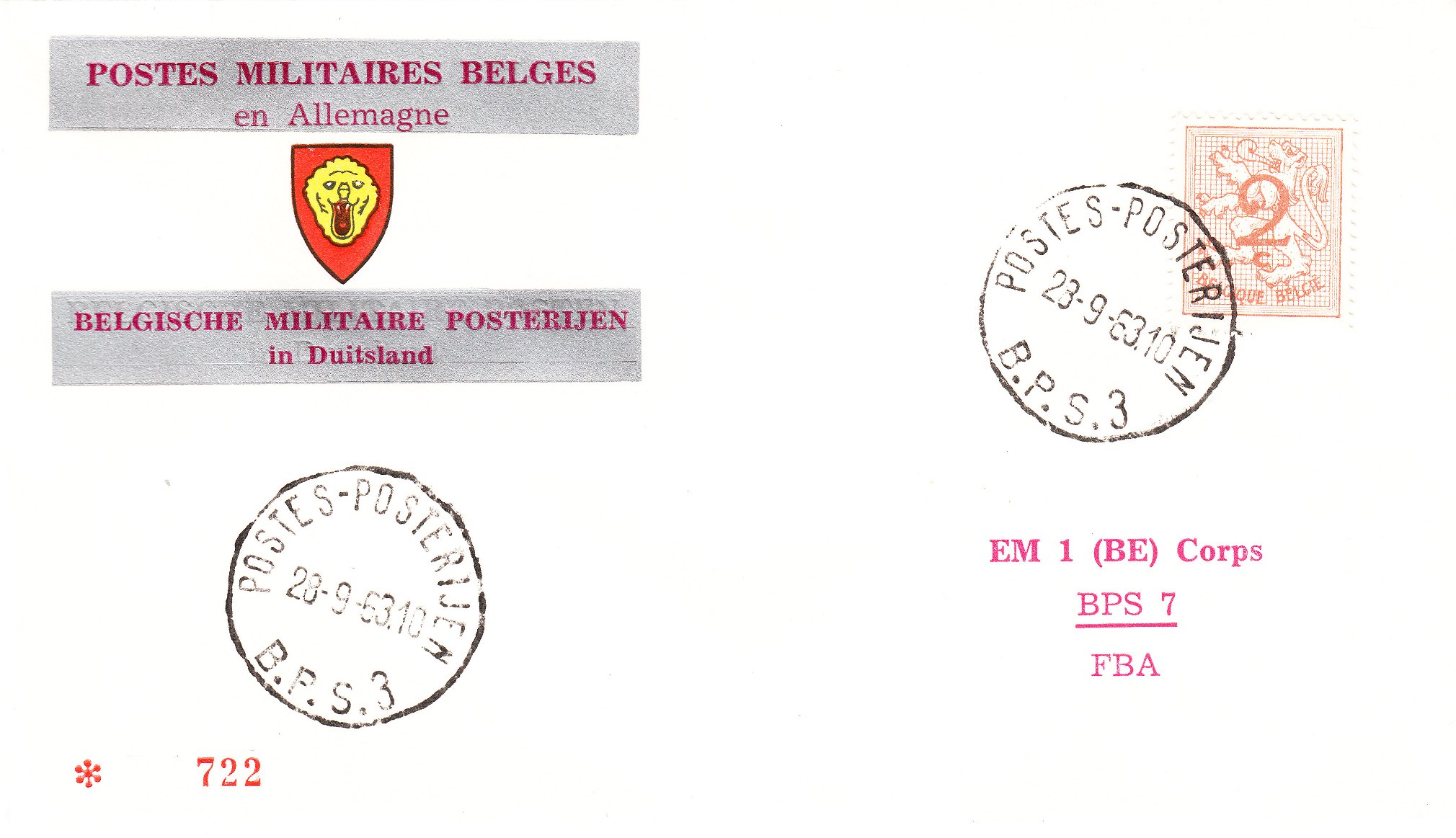 Hier ein aus einem Abonnement stammender Beleg des vom 01.12.1959 bis 1992 in Eschweiler Camp Zeebrugge stationierten B.P.S 2 vom 28.09.1963 mit Tagesstempel Typ K: