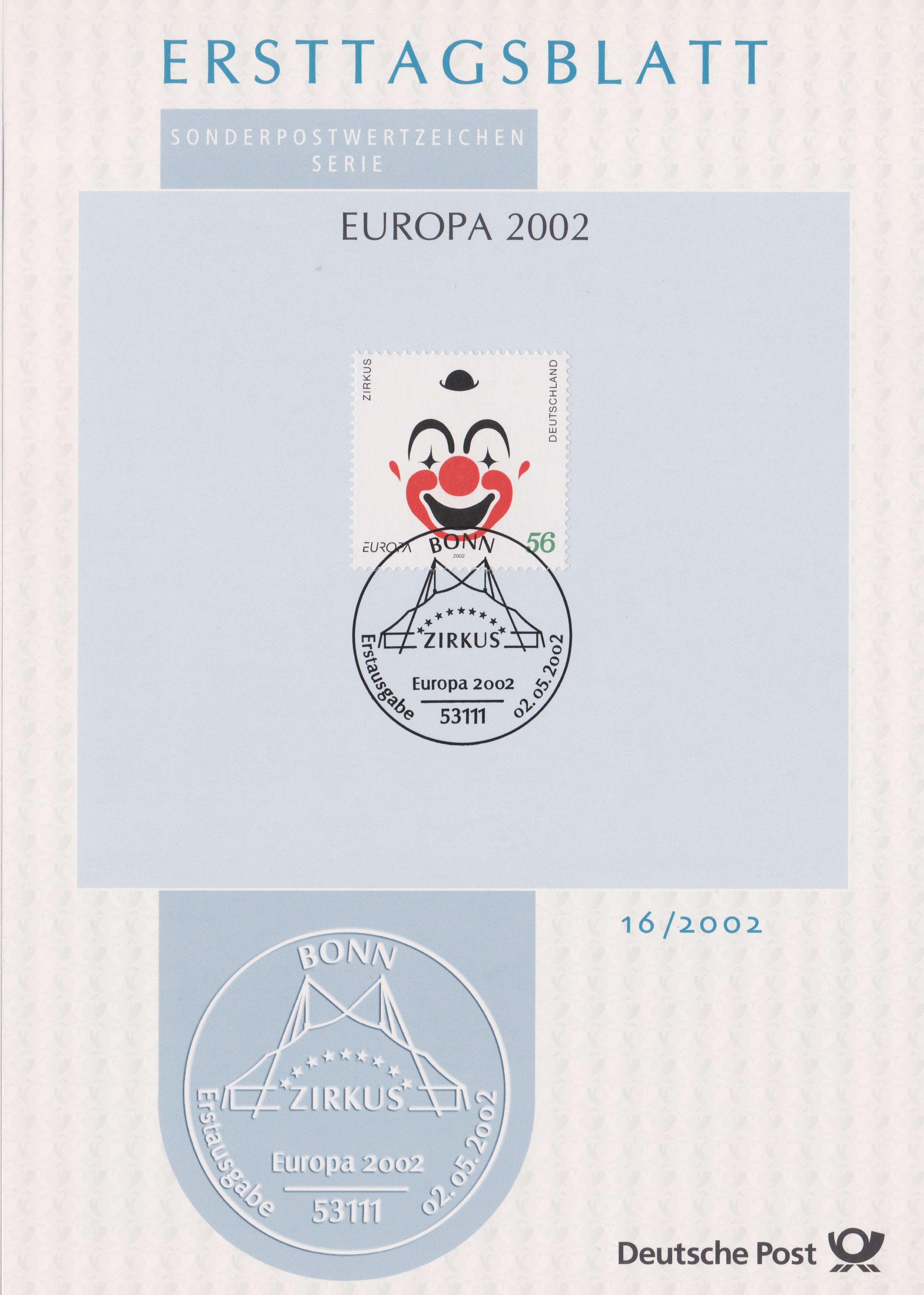 Die Europamarke 2002 der Deutschen Post erschien am 4. Juli auch in der selbstklebenden Version in der Rolle in einer Auflage von 38 578 000 Stück. Hier ein gestempeltes Exemplar: