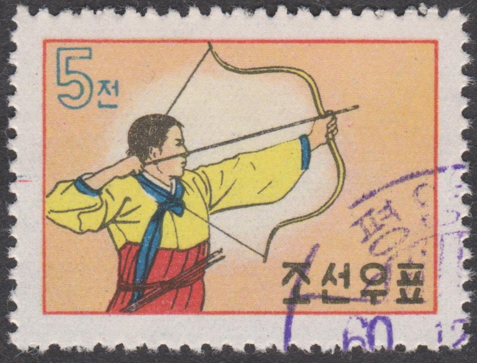 Nordkorea MiNr. 267 bis 270 erschienen am 15.12.1960 zum Thema "Nationalsport" und zeigen die Sportarten Ringen, Schaukeln, Bogenschießen sowie Wippen: