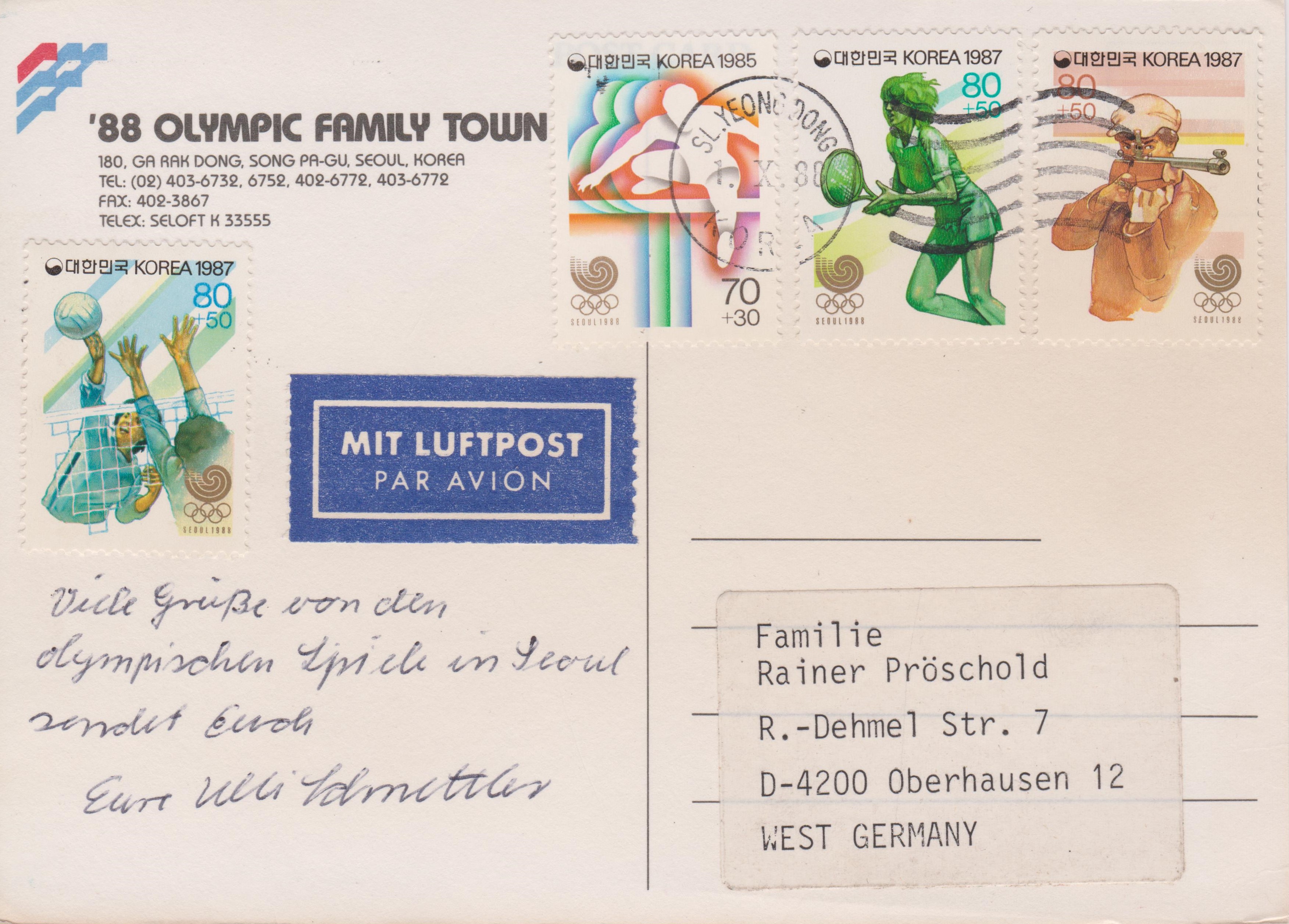 Postkarte per Luftpost, adressiert nach Deutschland, aufgegeben am 01.10.1988 in SEOUL: