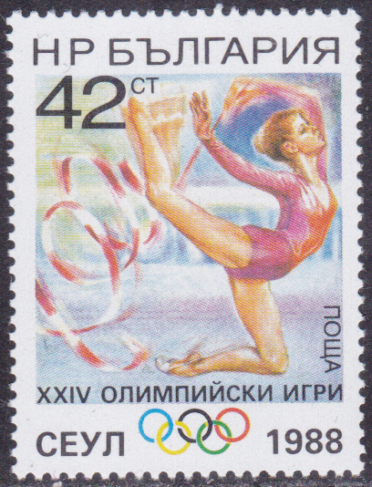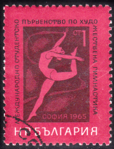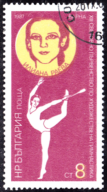 Eine Marke aus Bulgarien (MiNr 3589) zu den Weltmeisterschaften 1987 in der Rhythmischen Sportgymnastik in Varna zeigt Iliana Raycheva Raeva bei einer Übung mit der Keule.