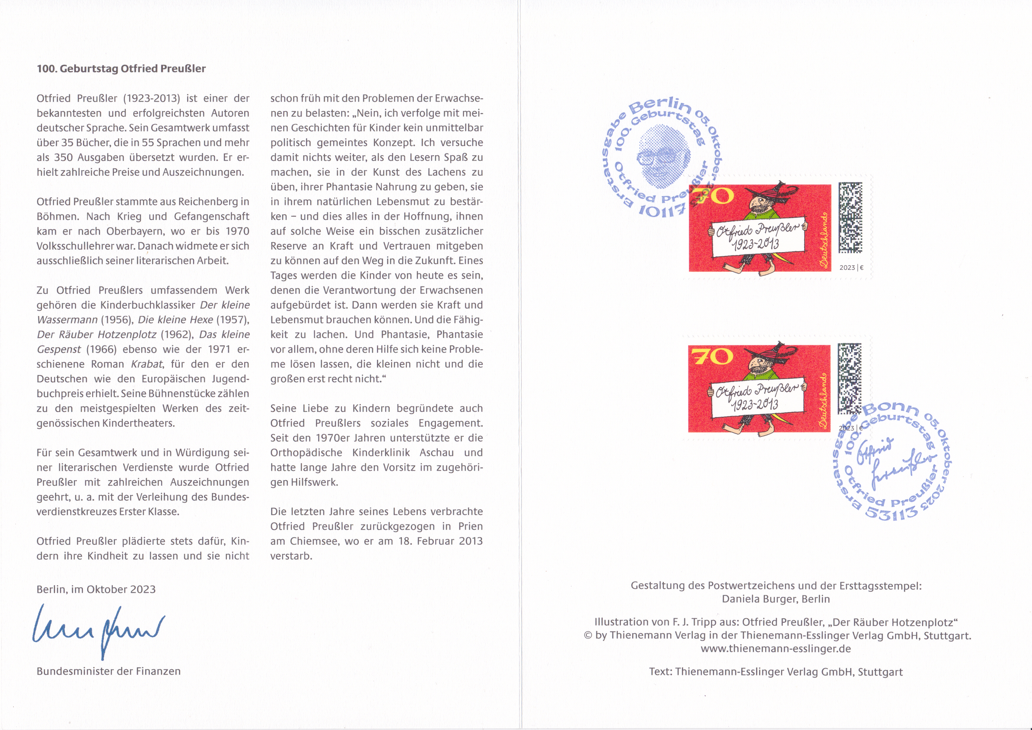 Ministerkarte des Bundesministers für Finanzen mit zwei Marken (MiNr 3788) zum 100. Geburtstag von Otfried Preußler und den beiden Ersttagsonderstempel Bonn und Berlin.