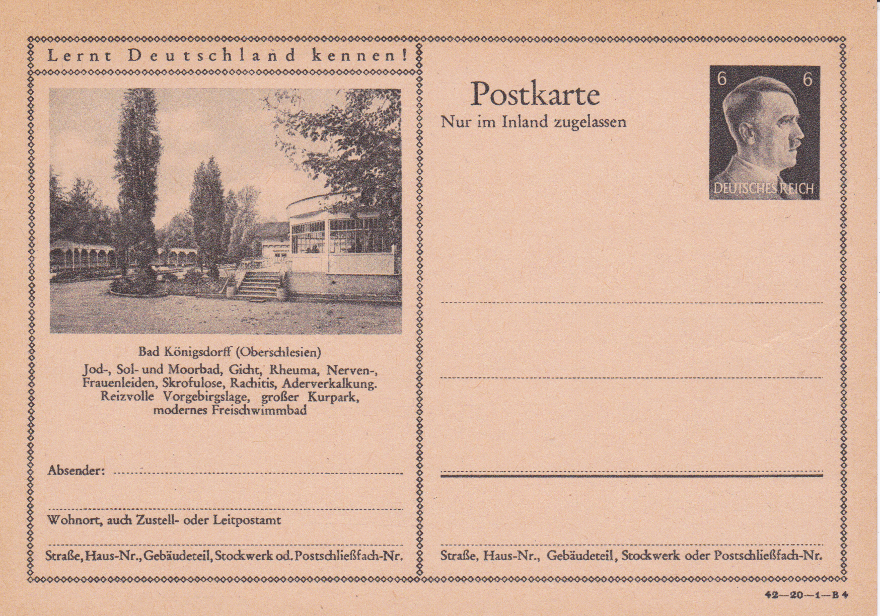 Bad Königsdorff (Oberschlesien) wirbt mit dieser Bildpostkarte (Serie 20 Bild 4) als Jod-, Sol- und Moorbad. Bad Königsdorff heißt heute Jastrzębie-Zdrój und ist eine oberschlesische Stadt im Süden Polens. Sie liegt rund 100 km westlich von Krakau sowie etwa 30 km nordöstlich von Ostrava in unmittelbarer Nähe der tschechischen Grenze.