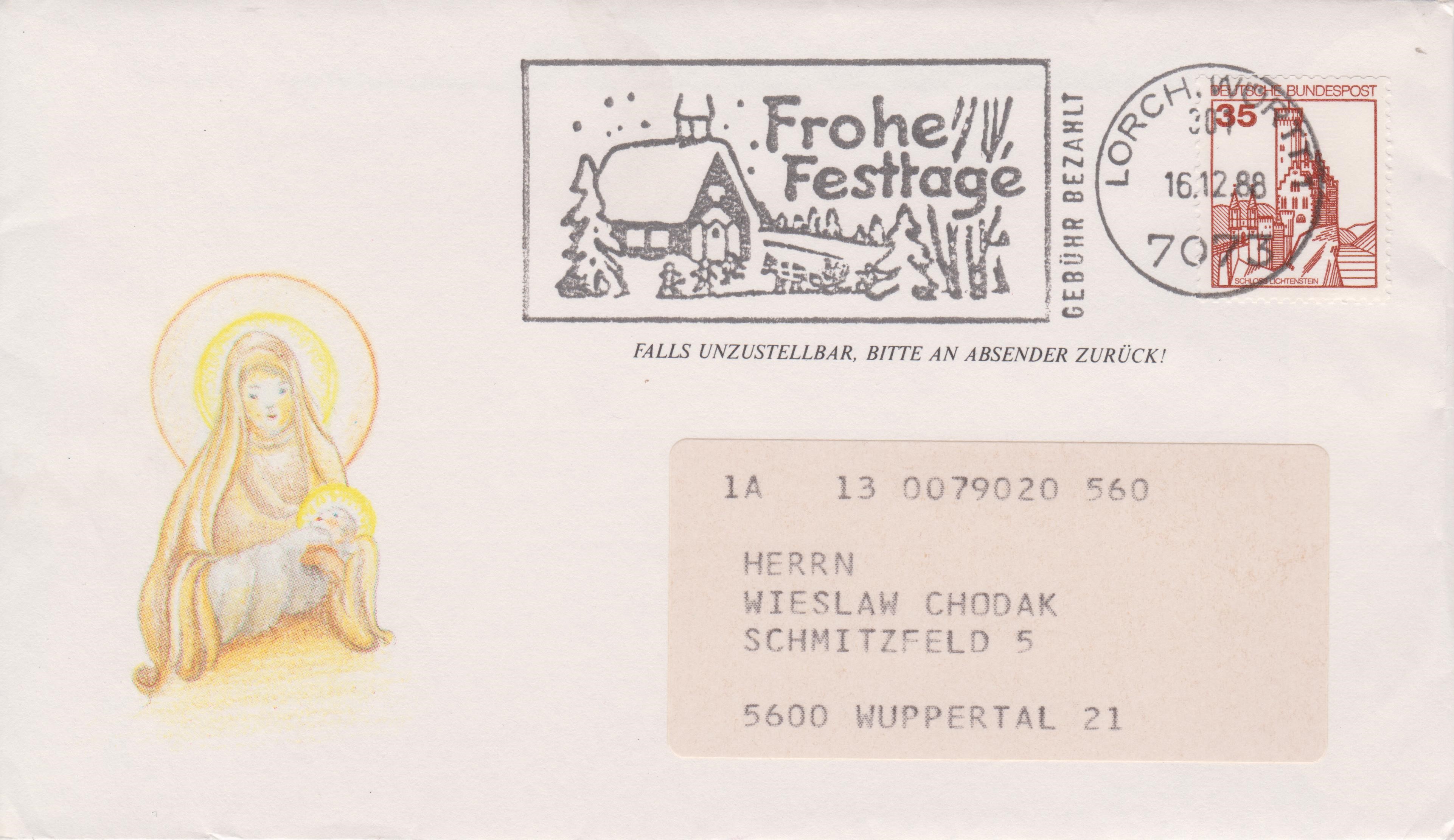 Absenderentwerterstempel der Firma Hermann E. Sieger mit dem Text "Frohe Festtage" vom 16.12.1988, Portostufe 35 Pf: