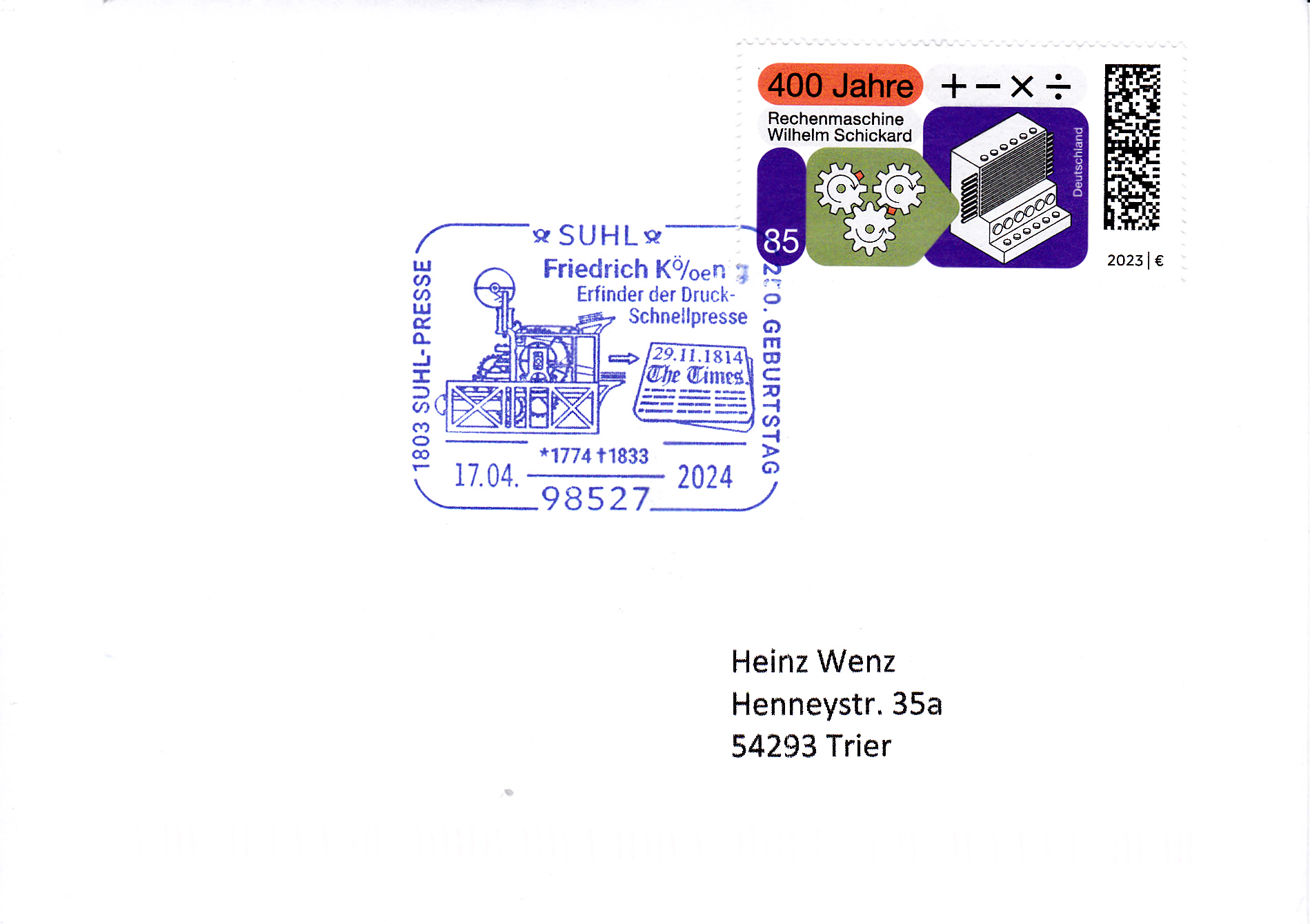 Im Sonderstempel vom 17.4.2024 aus Suhl zum 250. Geburtstag von Friedrich Koenig sehen wir eine Darstellung zu diesem Ereignis.