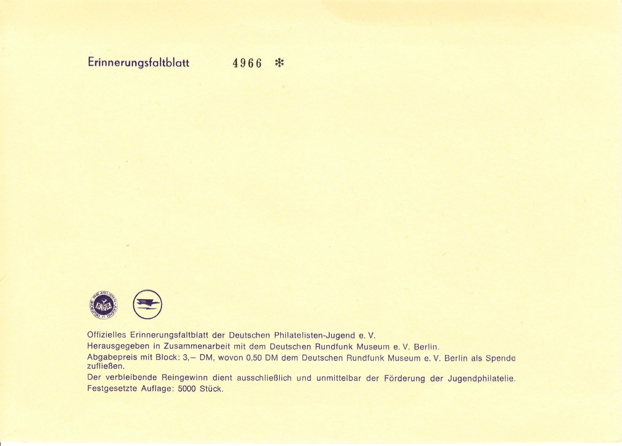 In einer Auflage von gerade einmal 5.000 Stück wurde damit dieses Erinnerungsfaltblatt von der Deutschen Philatelisten-Jugend e. V. aufgelegt und für 3 DM pro Stück abgegeben. Dieses ist die Nummer "4966":