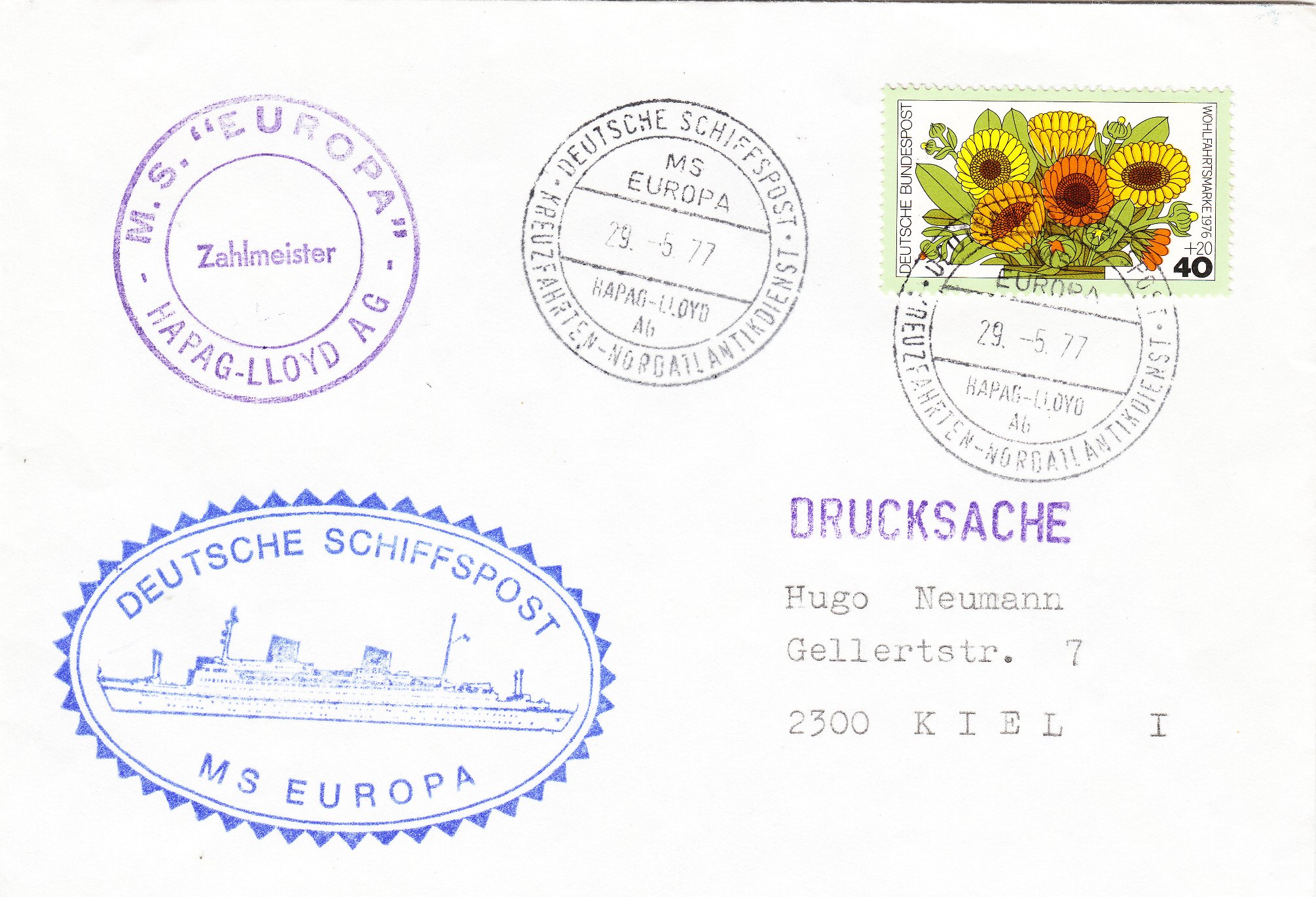Satzbrief der Europamarken 1977, aufgegeben an Bord des Kreuzfahrtschiffs "MS EUROPA" und der Post übergeben in ARRECIFE am 10.04.1981: