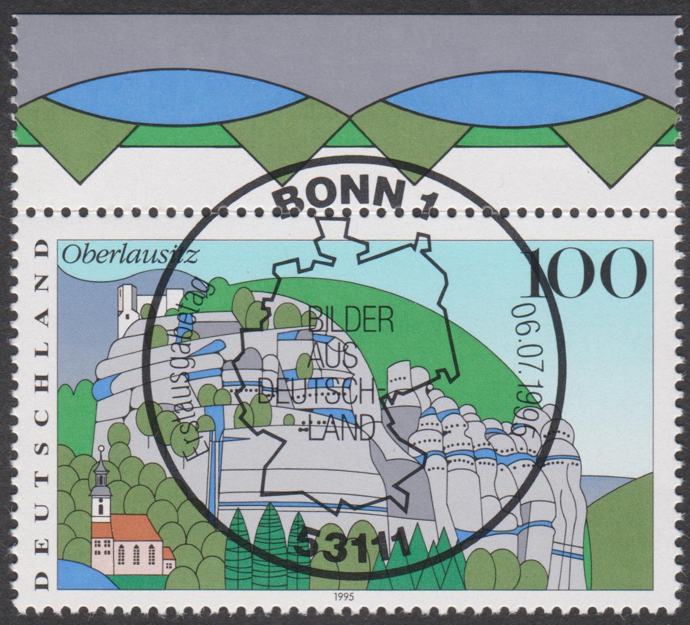 Bund MiNr. 1809 aus der Serie "Bilder aus Deutschland" zeigt das Zittauer Gebirge in der Oberlausitz, hier ein Oberrandstück mit Ersttagssonderstempel 53111 BONN 1 vom 06.07.1995: