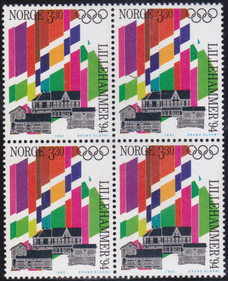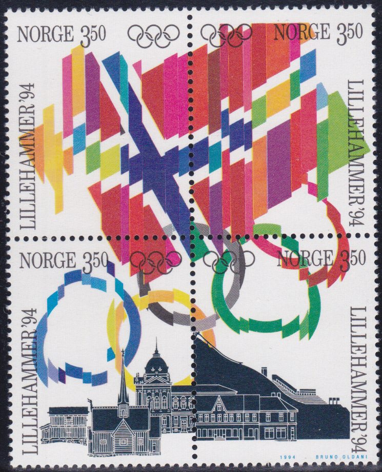 1992 ist in Norwegen eine Marke (MiNr 1105) zu den Winterspielen 1994 mit Flaggen und Gebäude in Lillehammer erschienen. Von dieser Marke zeige ich einen Viererblock.