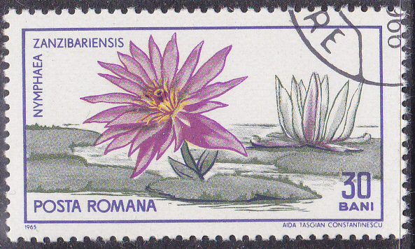 Aus Rumänien kommt diese Marke (MiNr 2445) mit einer Bunten Seerose (Nymphaea nouchali var. zanzibariensis) Michel nennt als Name Seerose (Nymphaea capensis).