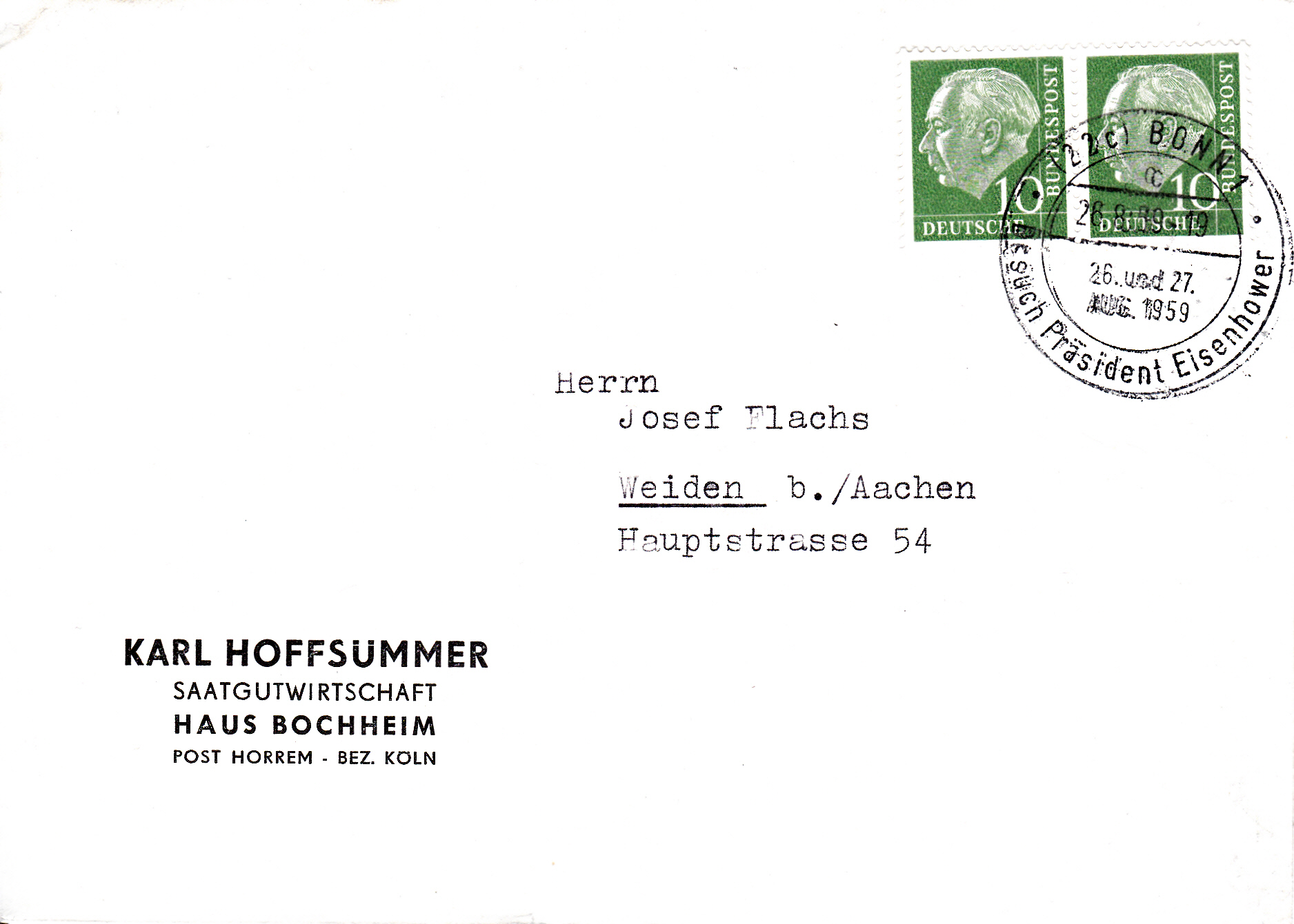 Waagerechtes Paar der Marke zu 10Pf (MiNr 183x) auf Inlandsbrief bis 20g von Bonn nach Weiden b. Aachen mit einem Sonderstempel Bonn vom 26.8.1959 zum Besuch von Präsident Eisenhower.