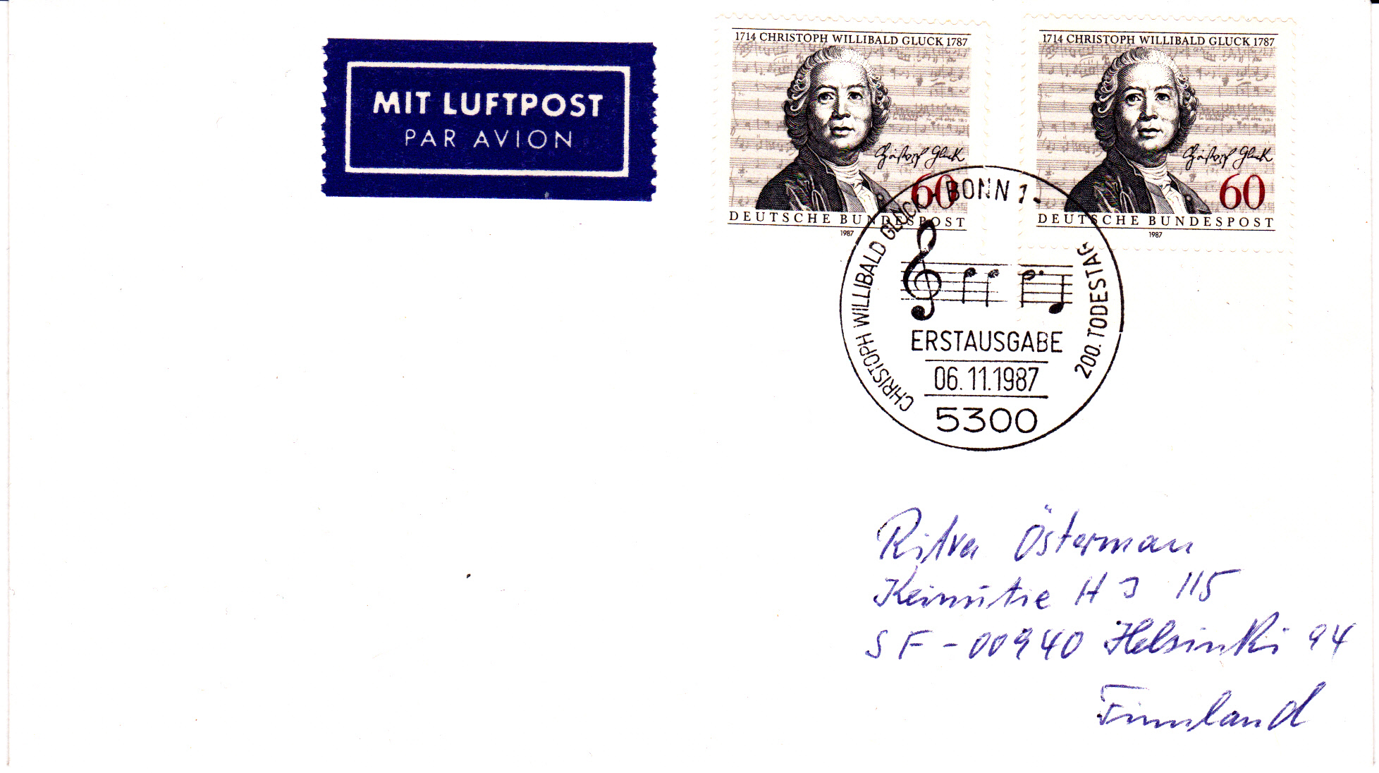 Zu seinem 200.Todestag verausgabte die Deutsche Bundespost am 6.November 1987 eine Sondermarke mit seinem Porträt. Hier eine Mehrfachfrankatur auf einem frankaturgerechten Brief bis 20 g nach Finnland mit Ersttagssonderstempel Bonn.
