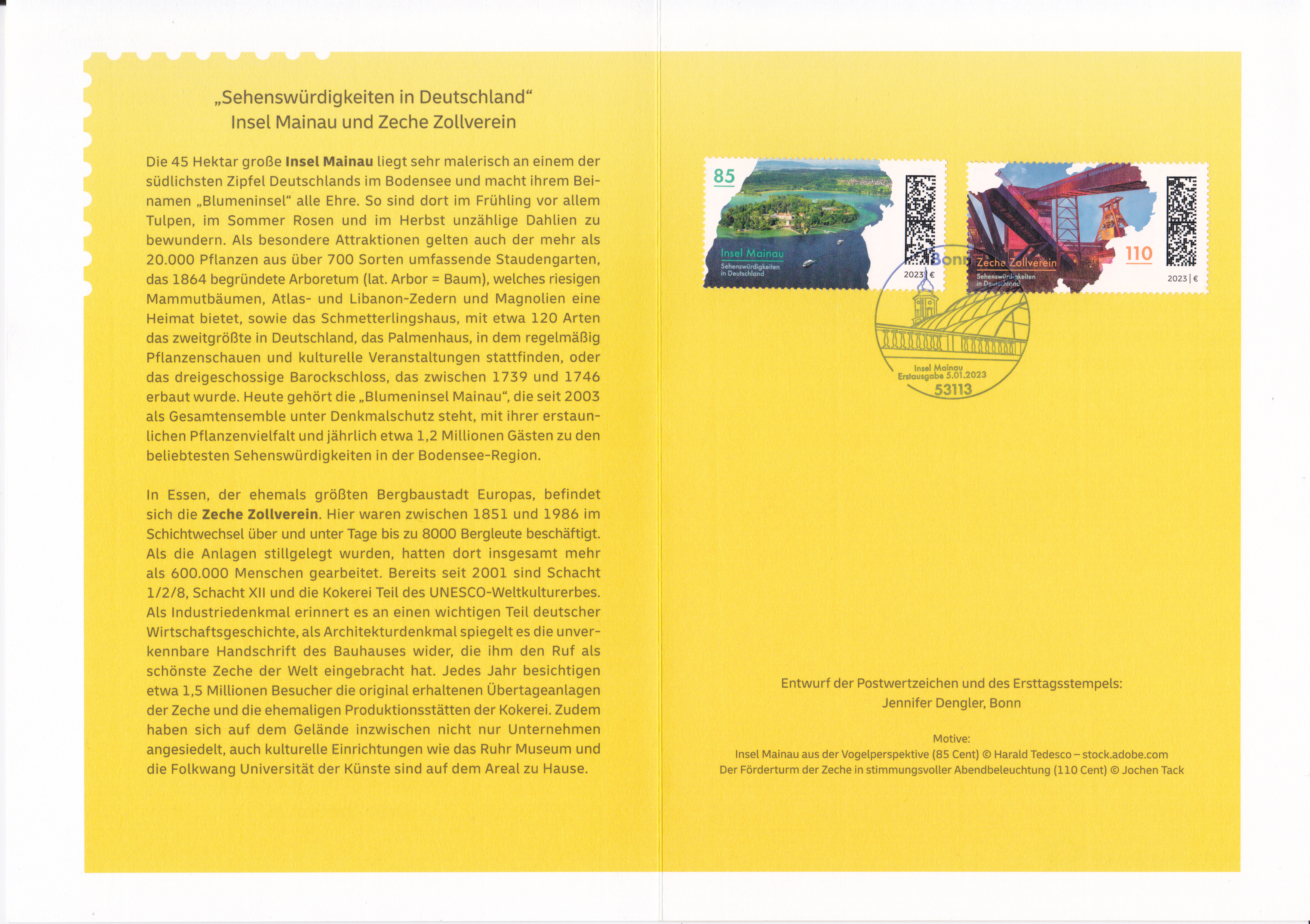 Klappkarte des Vorstandsvorsitzenden der Deutschen Post AG mit je einer Marke "Blumeninsel Mainau" und "Zeche Zollverein" aus der Serie "Sehenswürdigkeiten in Deutschland"(MiNr 3738 und 3739) und dem Ersttagsonderstempel Bonn.