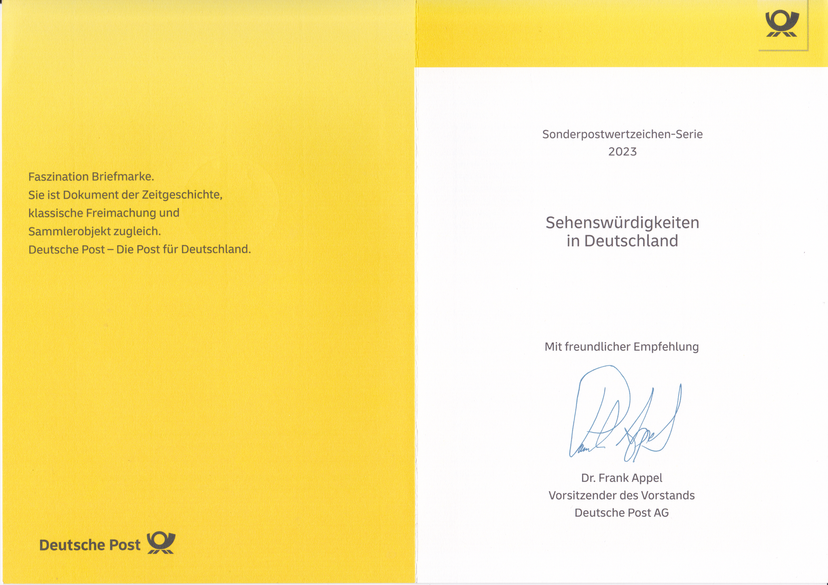 Klappkarte des Vorstandsvorsitzenden der Deutschen Post AG mit einer Marke (MiNr 3752) zum Tag der Briefmarke 2023 mit dem Stralsund-Brief und dem Ersttagsonderstempel Bonn.