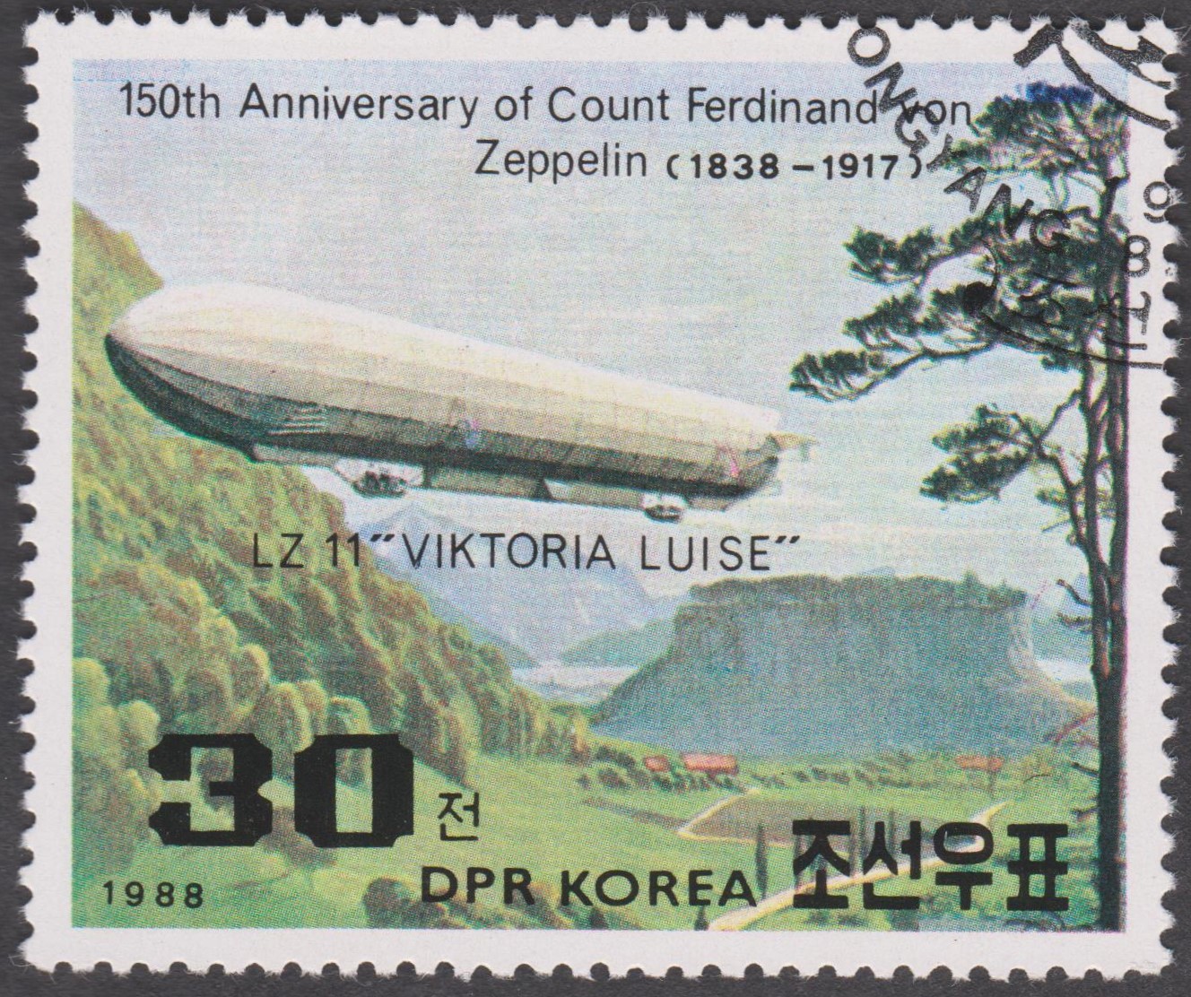 Nordkorea MiNr. 2950 erschien am 21.08.1988 zum 150. Geburtstag von Ferdinand Graf von Zeppelin und zeigt LZ 11 "VIKTORIA LUISE":