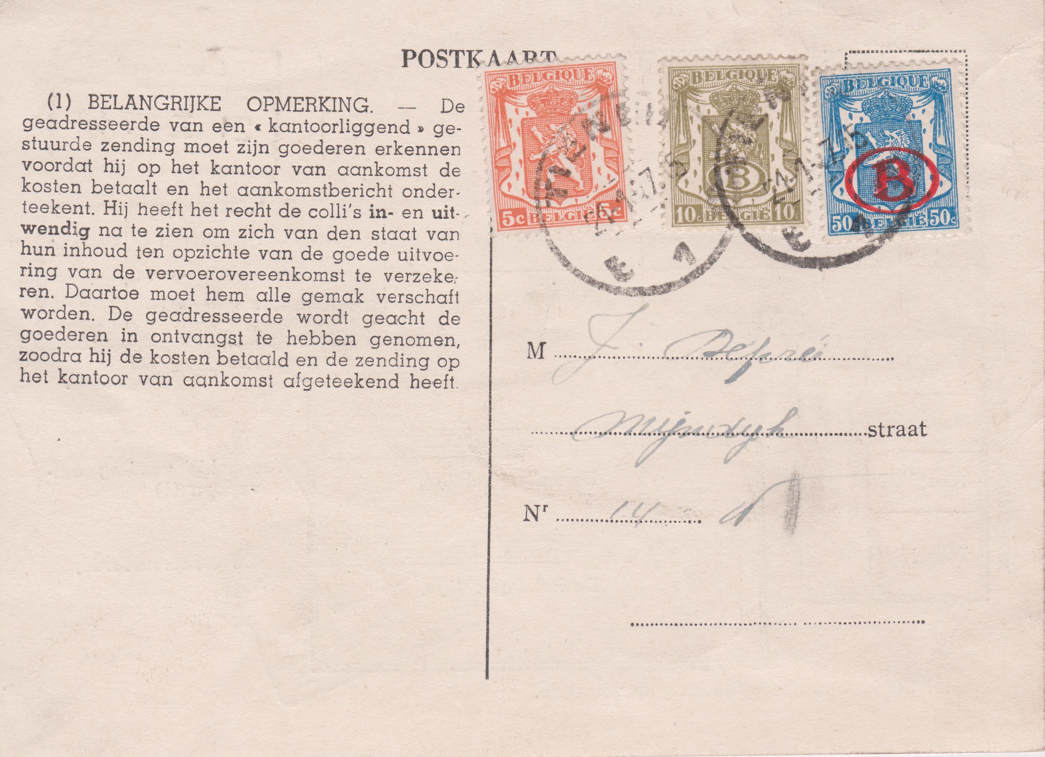 Mischfrankatur der Dienstmarken MiNr. 28 und 36 mit Freimarken Belgien MiNr. 888 am 21.01.1947 auf Postkarte aus TIENEN: