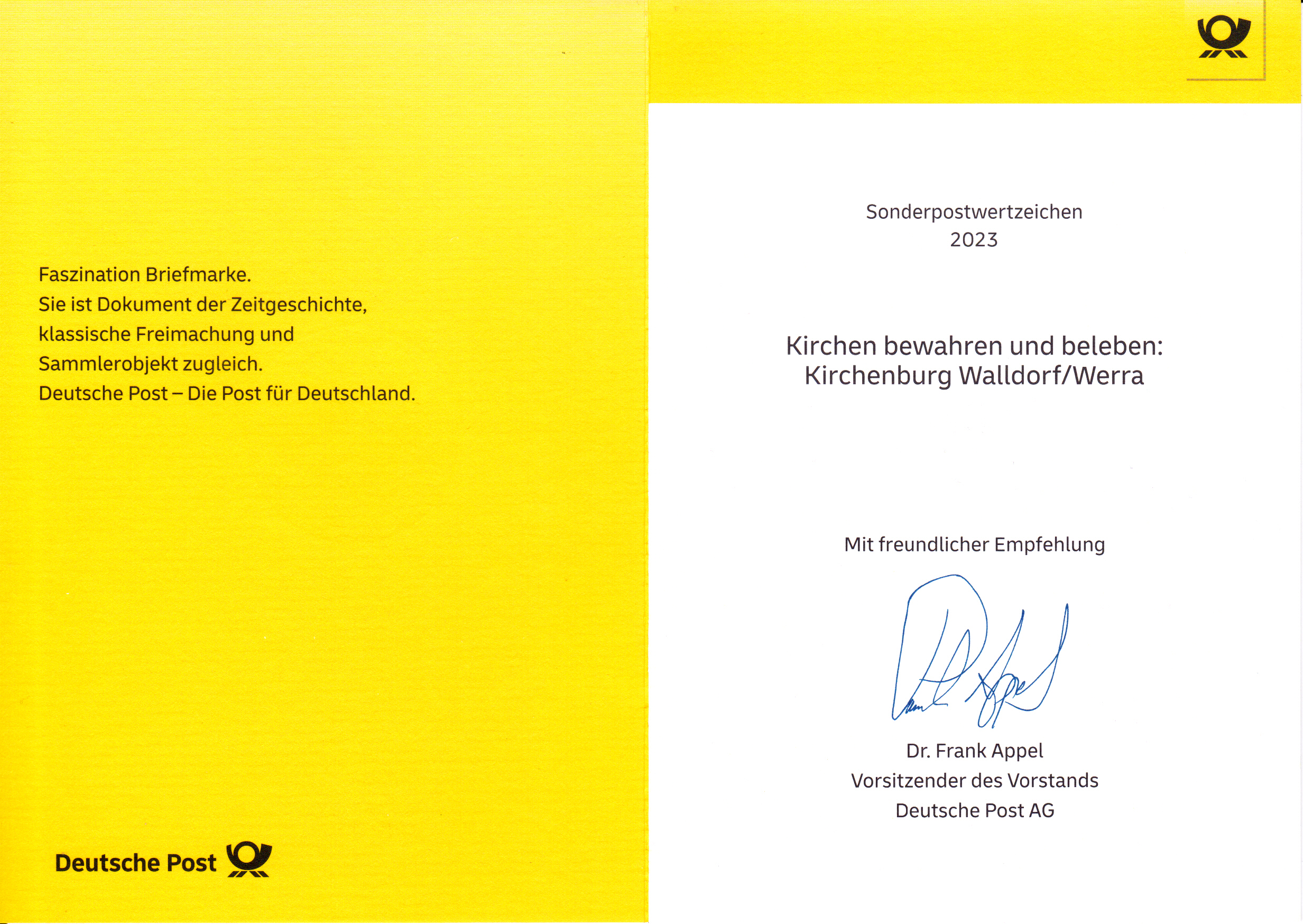 Klappkarte des Vorstandsvorsitzenden der Deutschen Post AG mit je einer Marke "U-Bahn-Haltestelle Reinoldikirche, Dortmund" und "U-Bahn-Haltestelle Wilhelm-Leuschner-Platz, Leipzig" aus der Serie "U-Bahn-Stationen" (MiNr 3759 und 3760) und dem Ersttagsonderstempel Bonn.