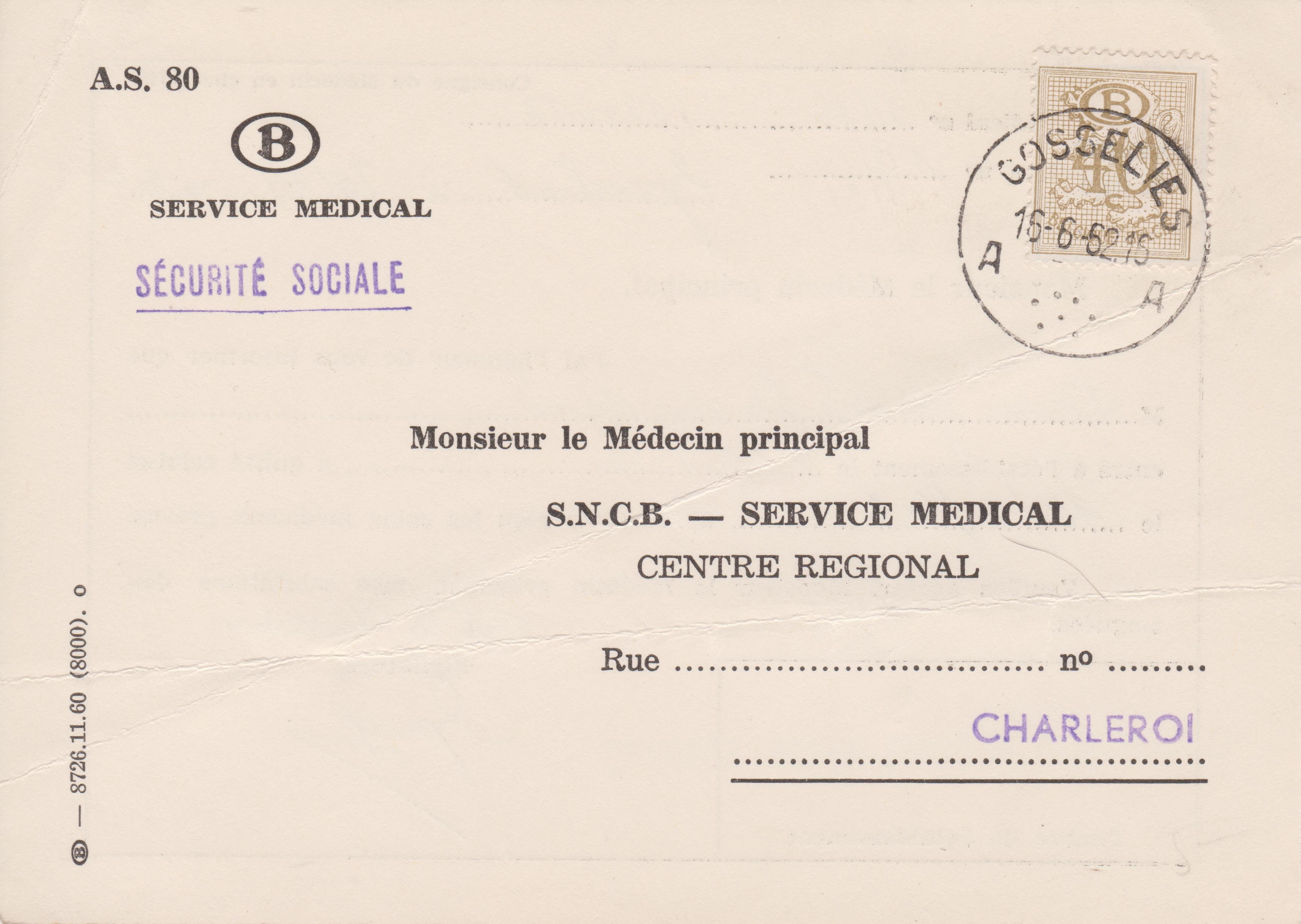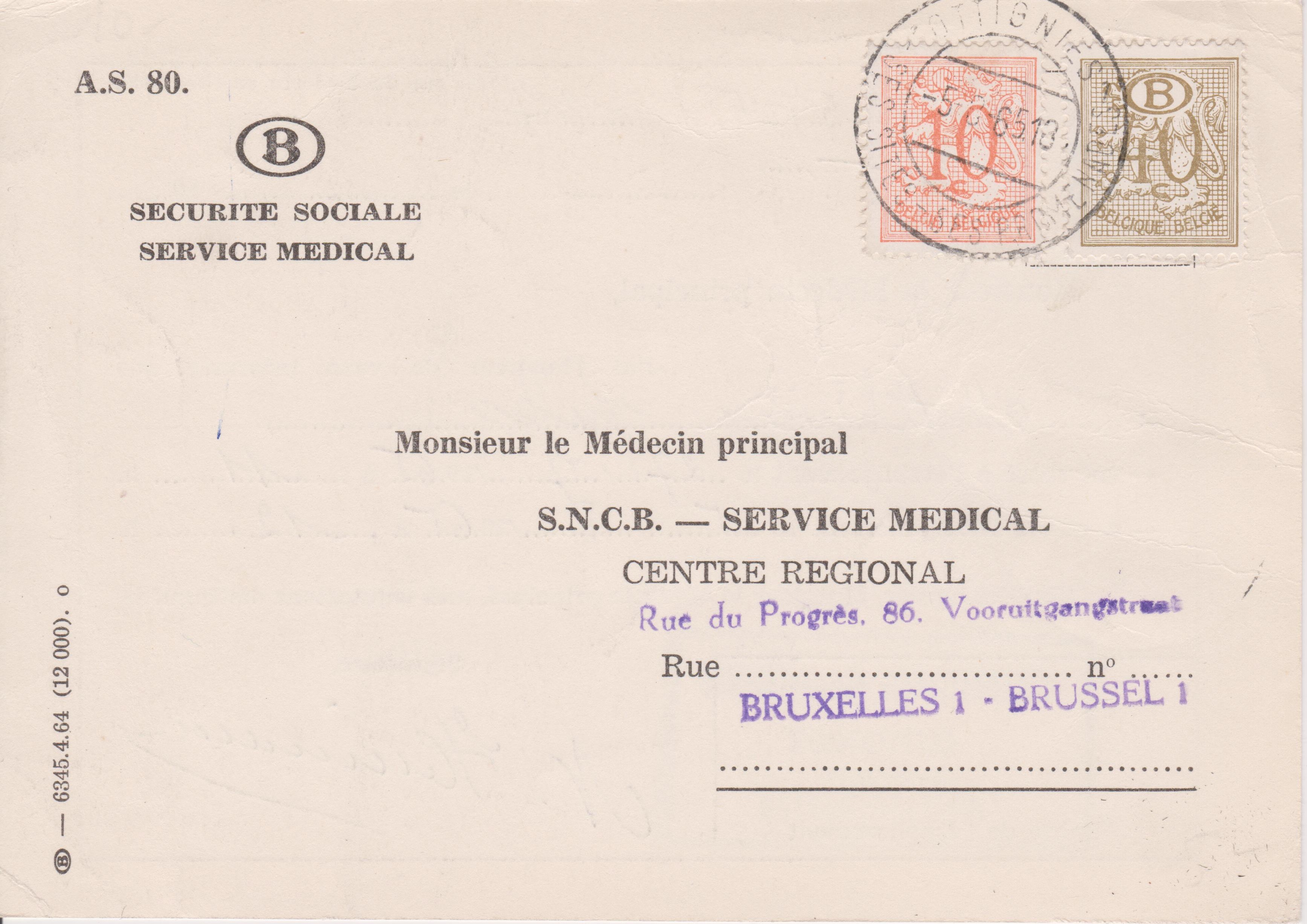 Einzelfrankaturen der Dienstmarke MiNr. 51 A am 10.11.1965 auf einer Sendung "SECURITE SOCIALE SERVICE MEDICAL" ab GOSSELIES: