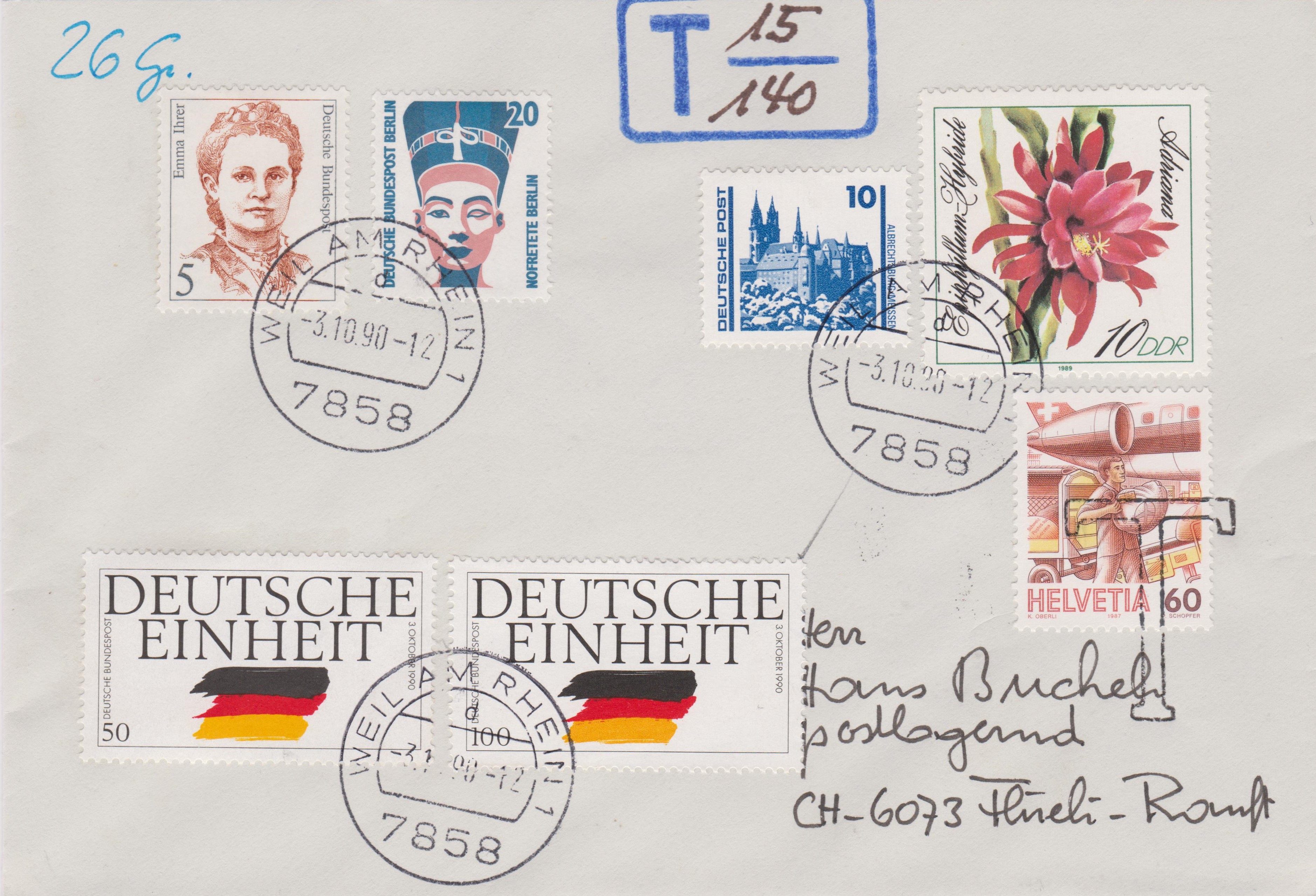 In der Schweiz wurde umgerechnet 15/140*90 Rappen = 9,6 Rappen, die zu 10 Rappen aufgerundet wurden. Hinzu kam eine Bearbeitungsgebühr in Höhe von 50 Rappen, so daß eine Nachgebühr von 60 Rappen resultiert, die verklebt und per T-Stempel entwertet wurde. Damit war die Deutsche Einheit dann auch philatelistisch in der Schweiz angekommen!