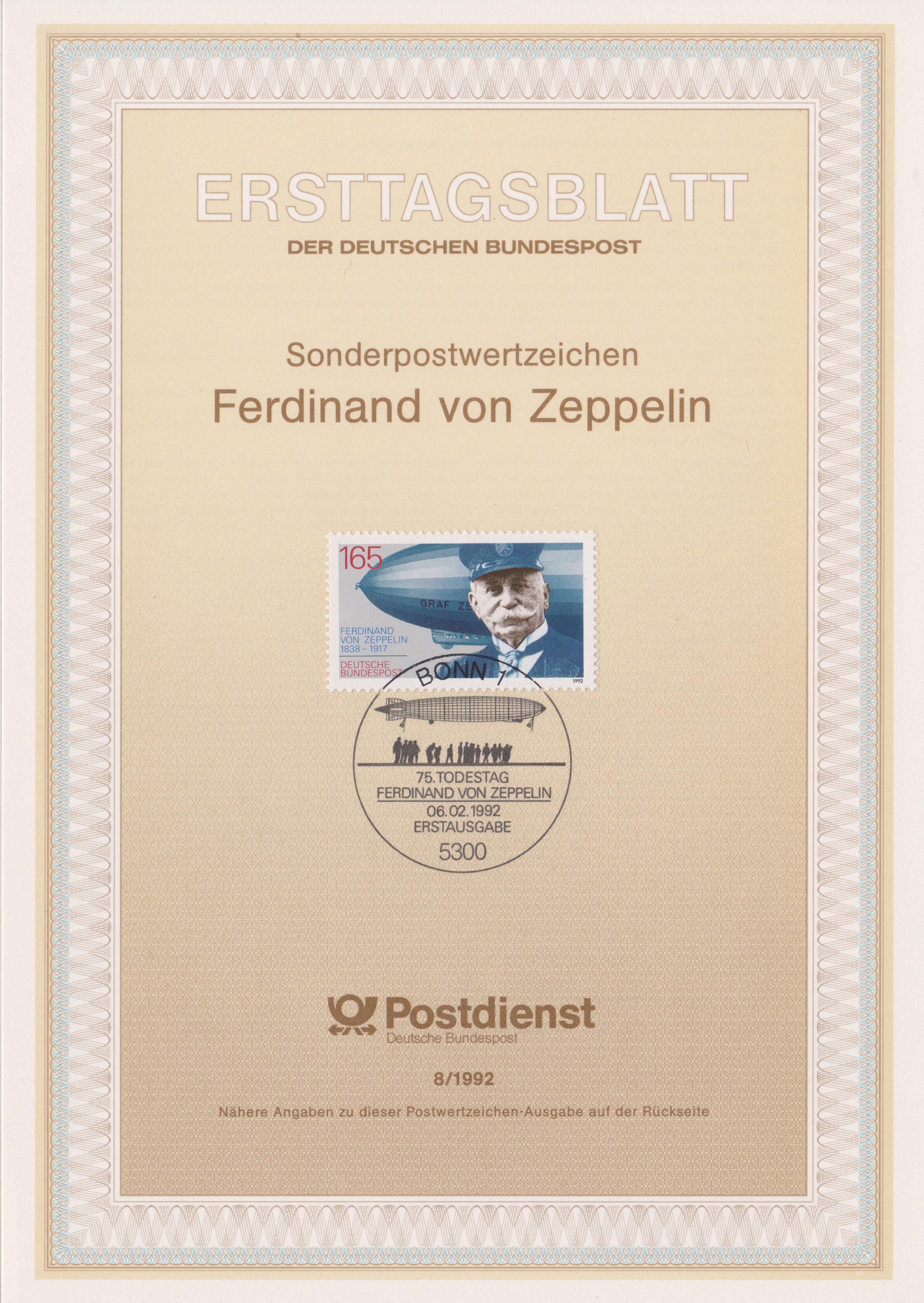 Die Marke zum 75. Todestag von Ferdinand Graf von Zeppelin der Deutschen Bundespost (MiNr 1597) mit seinem Porträt und dem Luftschiff LZ 127 Graf Zeppelin ist mit dem Ersttagsonderstempel Bonn entwertet.