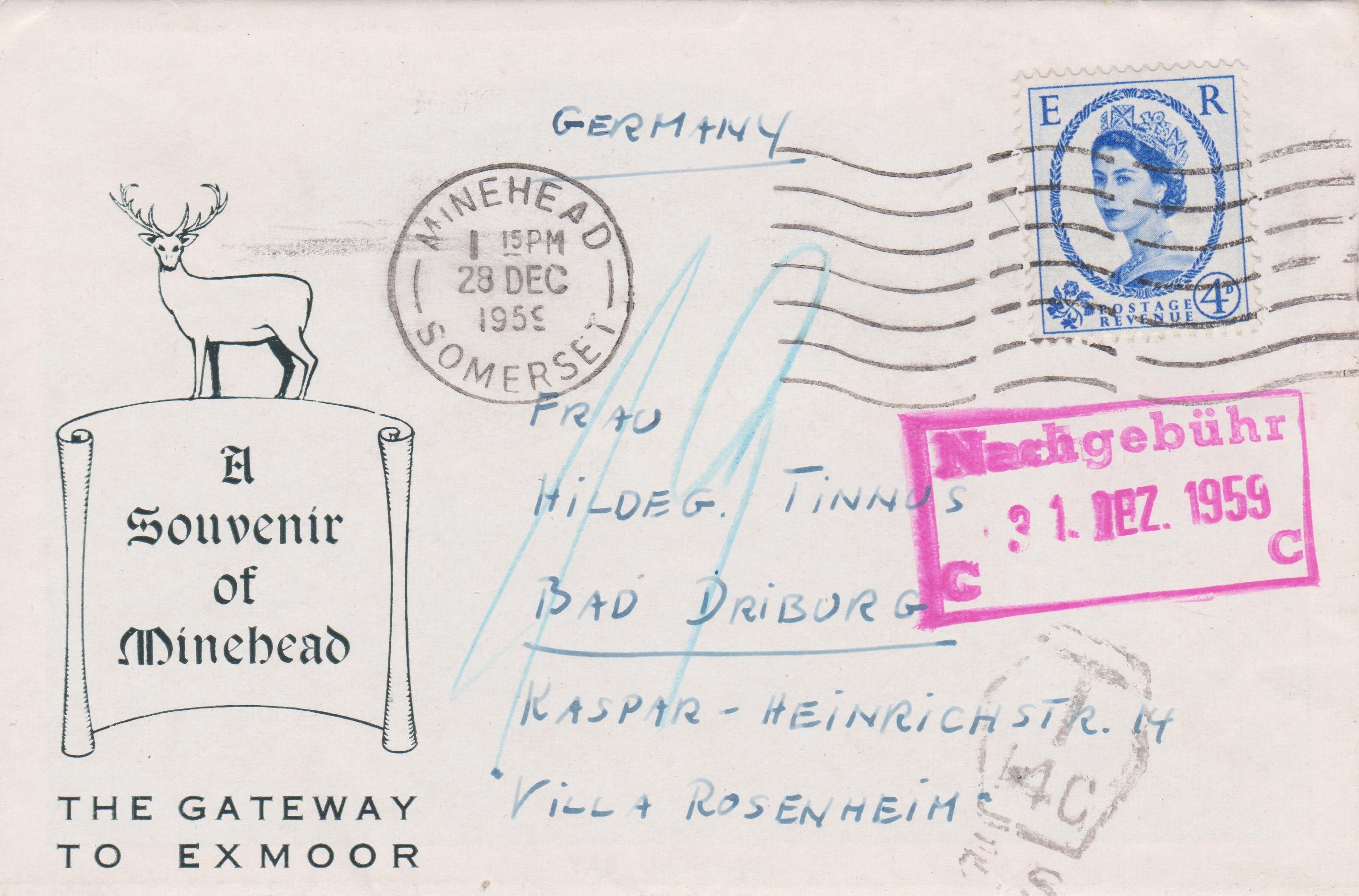 Die andere Postkarte hingegen wurde mit "13" Pfennig als Nachgebühr belegt, was per Blaustift vermerkt wurde und worauf ein Stempel "Nachgebühr" in Rot vom 15.07.1959 hinweist.