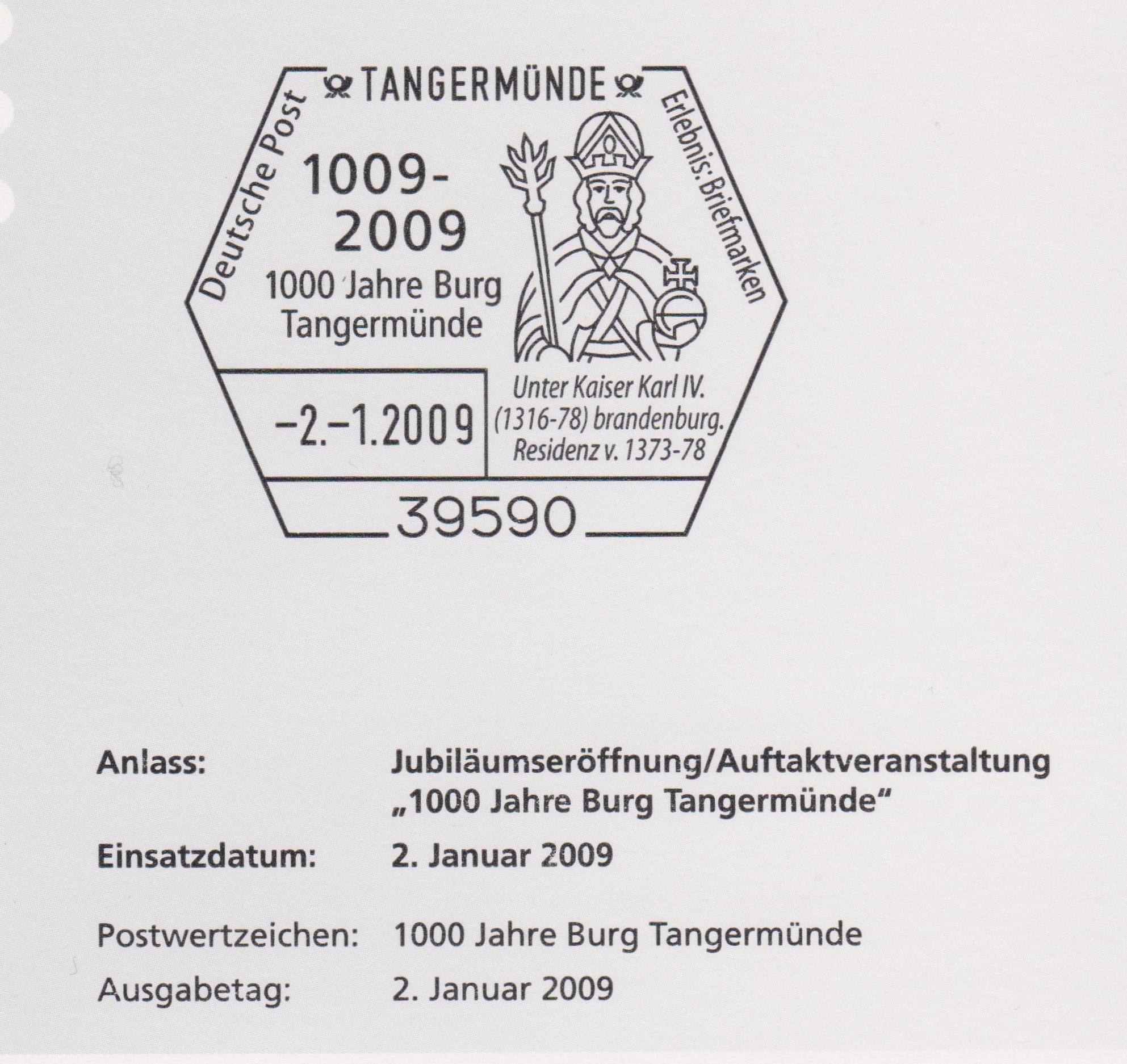 Der Ganzsachenumschlag der Eigenausgabe der Post (MiNr EA F 416) mit dem Vorausentwertungsdatum "-9.-3.2009" zeigt als Wertstempel das Motiv der Marke "1000 Jahre Burg Tangermünde" (MiNr. 2712).