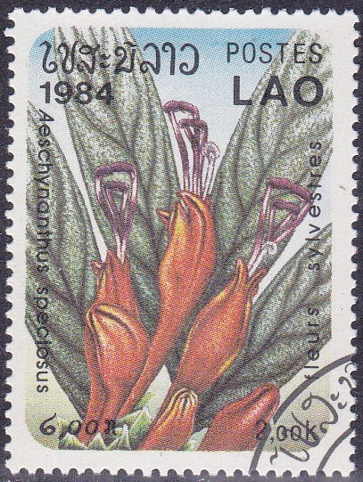 Auf einer Marke aus Laos (MiNr 745) werden Blüten einer Aeschynanthus speciosus gezeigt.