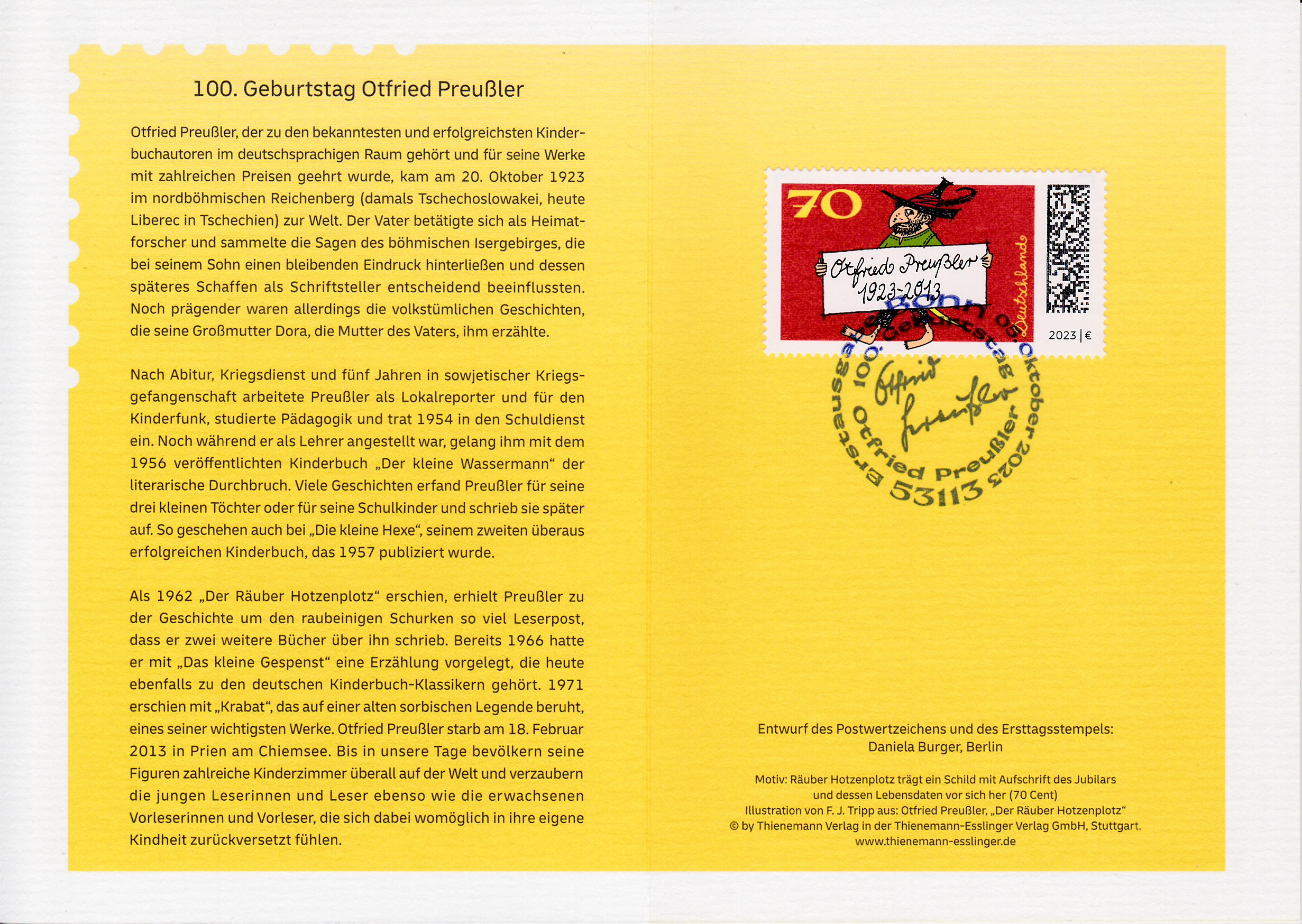 Klappkarte des Vorstandsvorsitzenden der Deutschen Post AG mit einer Marke (MiNr 3788) zum 100. Geburtstag von Otfried Preußler (1923-2013; böhmischer Kinder- und Jugendbuchautor) und dem Ersttagsonderstempel Bonn.