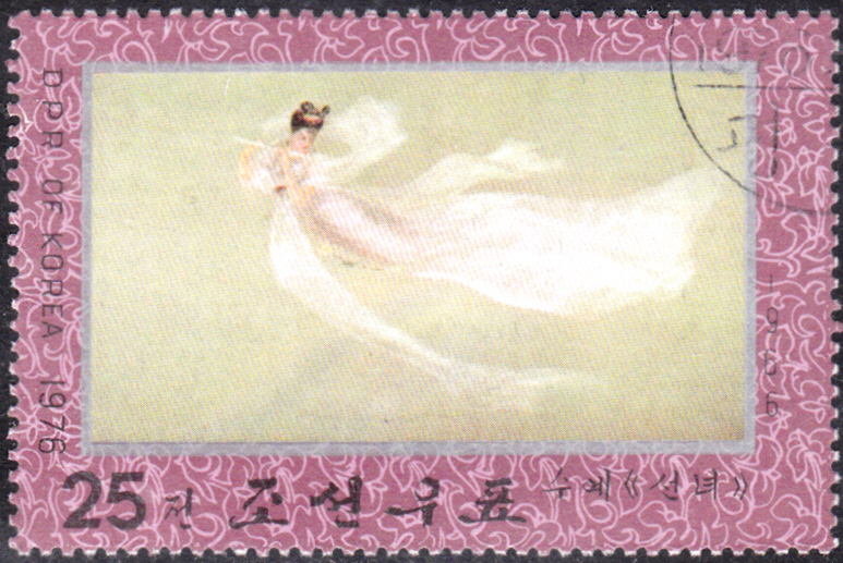 Die nächste Marke der Serie (MiNr 1548 A) zeigt eine Stickerei mit einer Flötenspielerin.